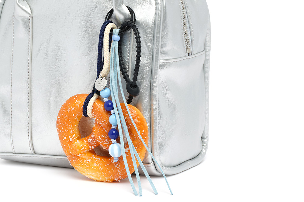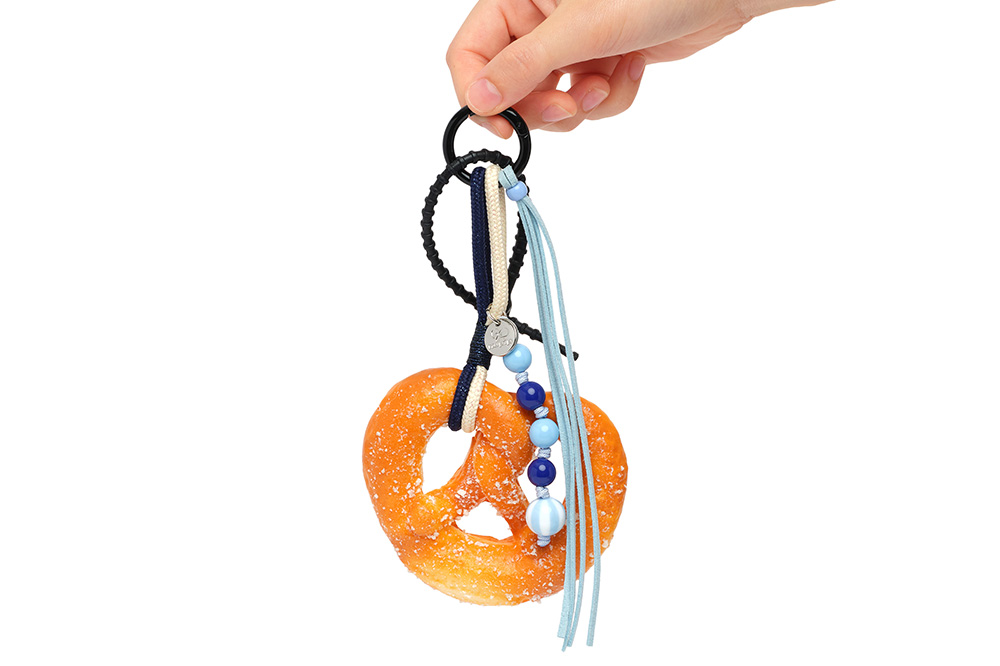 리얼한 프레첼 모양과 은은한 빵 향기가 매력적인 키링입니다. 블루톤의 비즈와 스트랩, 누핍의 실버 로고 참이 더해졌습니다.