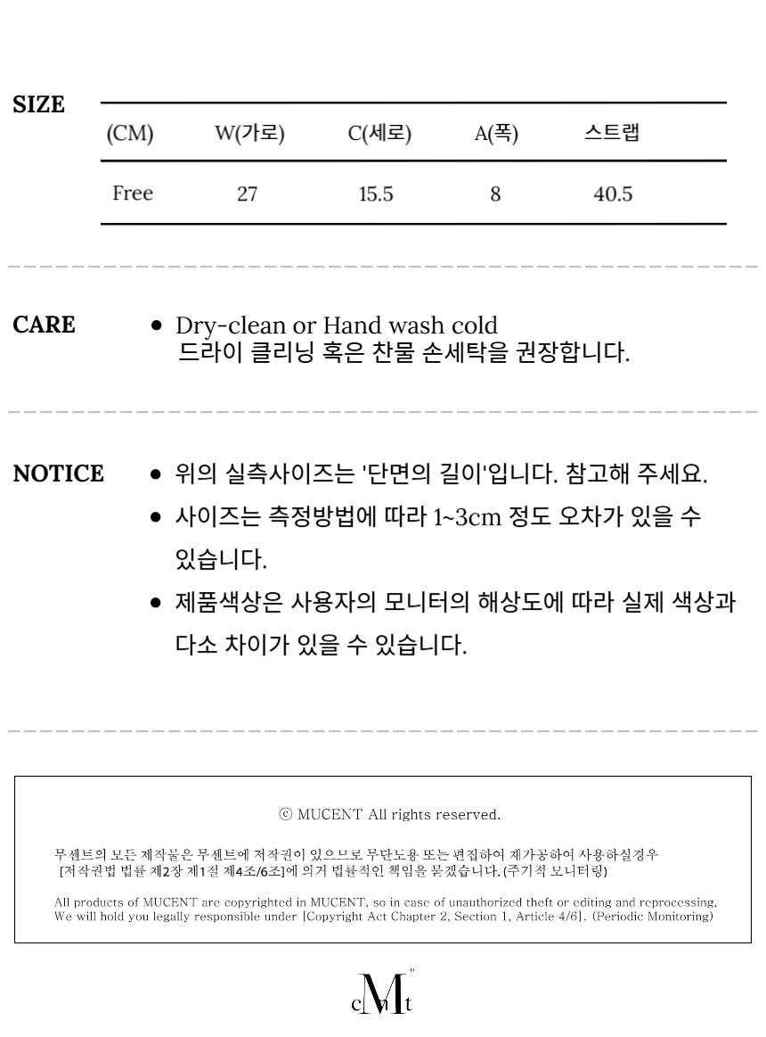 ┃Detail • 무센트 시그니처 메탈 로고 포인트 • 에어팟, 보조배터리, 립밤 등 간단한 소지품 수납 용이 • 데일리하게 착용가능 • 지퍼 여밈 방식으로 안전한 수납 가능 • 컴팩트한 사이즈 • 다양한 룩에 활용 가능한 미니멀한 디자인 ┃Material : Polyurethane 100% ┃Care : Dry cleaning - 무센트는 말기의 행성인 이 지구에서 지속 가능한 옷들을 고민합니다. 우리는 신념을 소비하는 미닝아웃을 지지합니다.