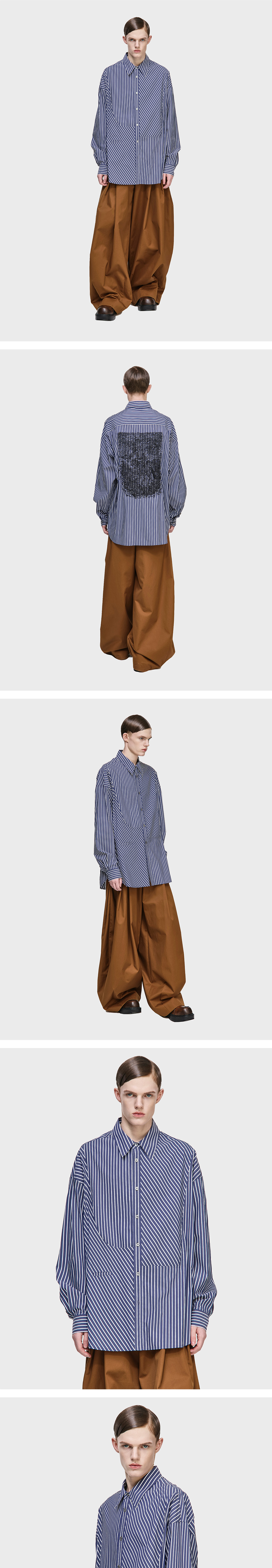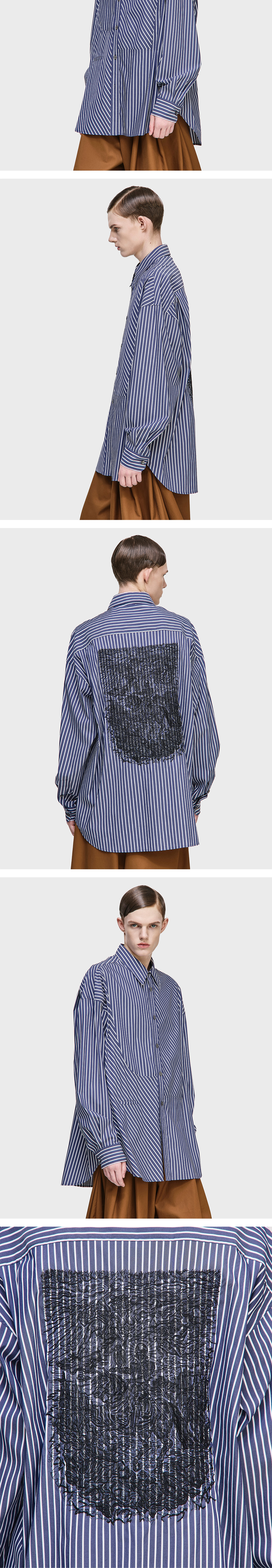- SONGZIO 컬렉션 라인 ‘KNIGHT’ EMBROIDERED SHIRT - 구김이 적고 매끈한 코튼혼방 패브릭 - 전면 비대칭적인 라인 구성과 스트라이프 각도의 ASYMMETRIC 턱시도 셔츠 디자인 - 전면 미니 웰트 포켓 디테일 - 후면 NEEDLE 엠브로이드 기법의 KNIGHT EMBROIDERED 아트워크 - 오버사이즈 실루엣 - MADE IN KOREA