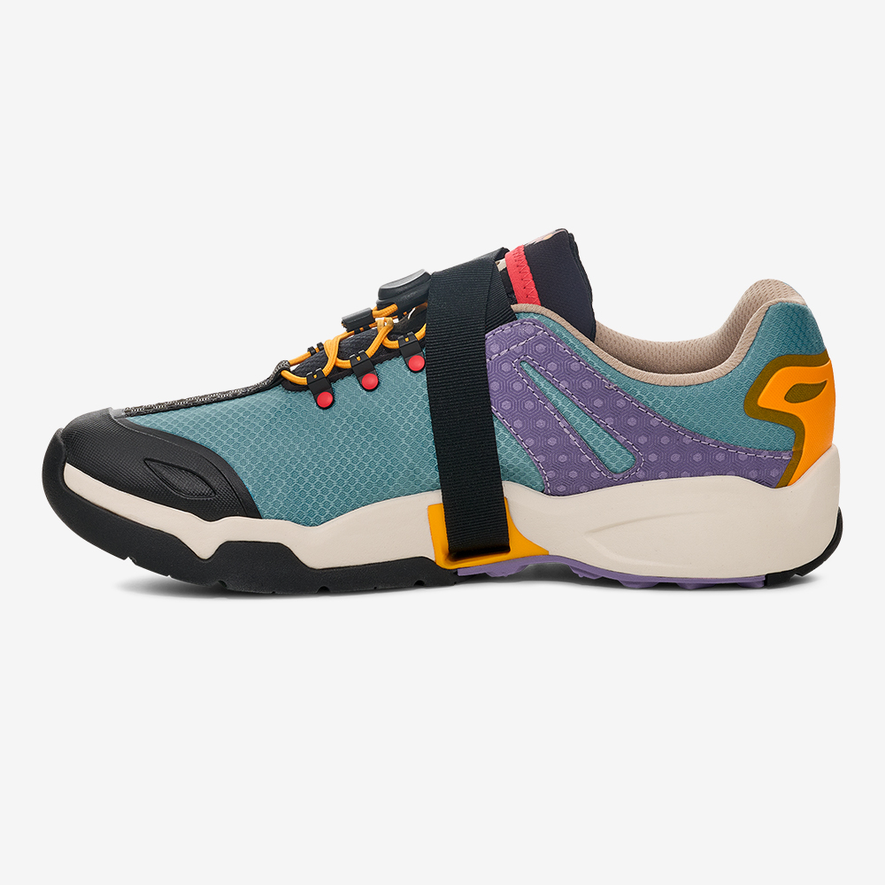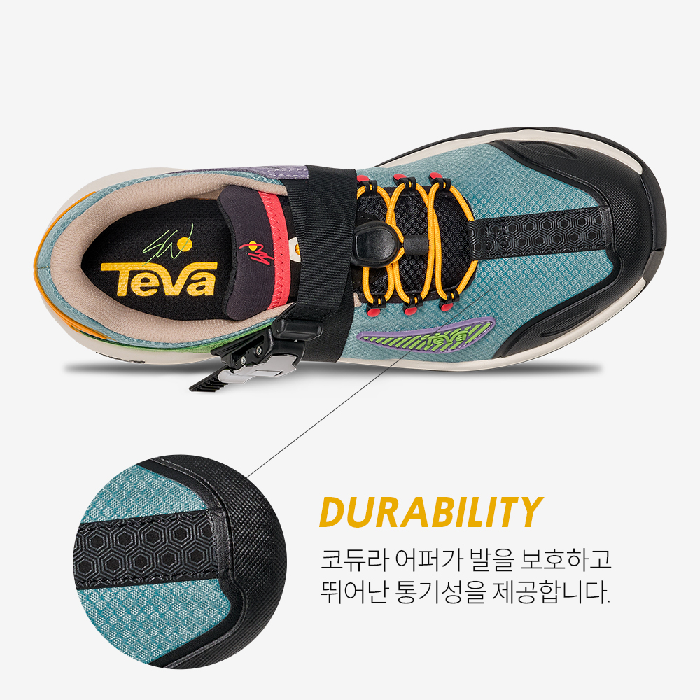 테바 2001년 아카이브에서 다시 꺼내, 미래 감성으로 재해석한 랩터 CT입니다. 통기성 좋은 코듀라 어퍼에 션 워더스푼 컬러 감각을 더해 퓨처리스틱한 무드를 완성했습니다. 360° 랩터 스트랩 시스템이 발 전체를 감싸며, 간편한 버클과 번지 레이스를 적용해 착용이 매우 간단합니다. 내구성 뛰어난 Durabrasion Rubber™ 아웃솔을 사용해 일상부터 아웃도어까지 착용 가능한 하이브리드 슈즈입니다.