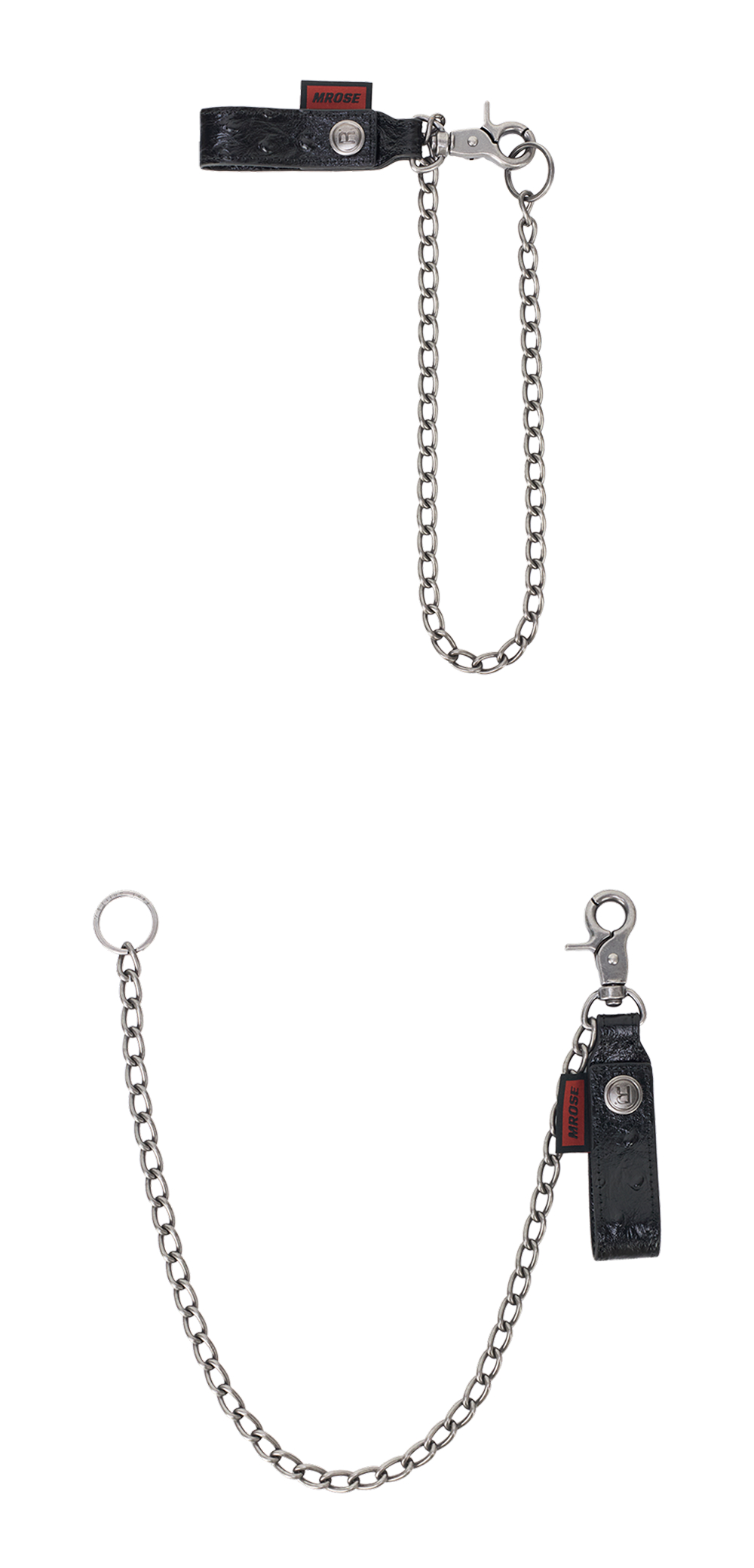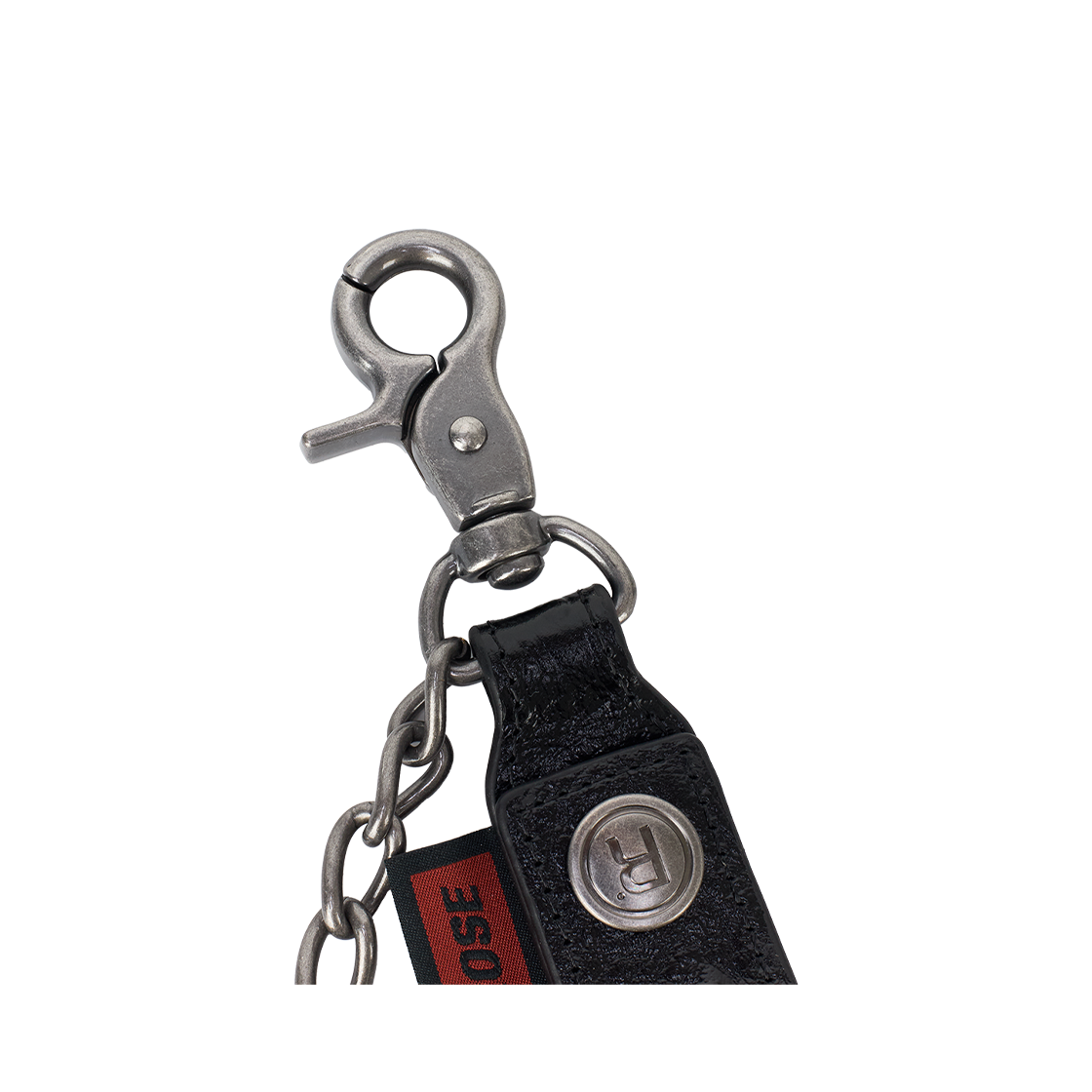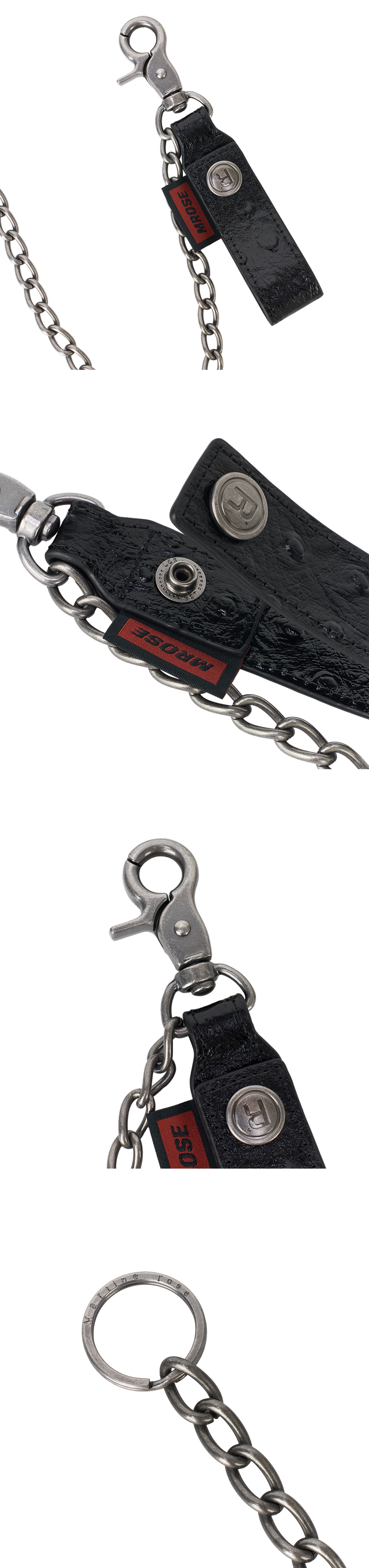 블랙 가죽 스트랩과 메탈 체인의 조화가 멋스러운 마틴 로즈 본디지 클립 체인 블랙 컬러입니다. - 커스텀 메탈 스냅 버튼 - 스냅 버튼으로 여닫는 레더 스트랩 - 스트랩 상단 레드 컬러 로고 라벨 - 견고한 메탈 체인 - 카라비너형 클립
