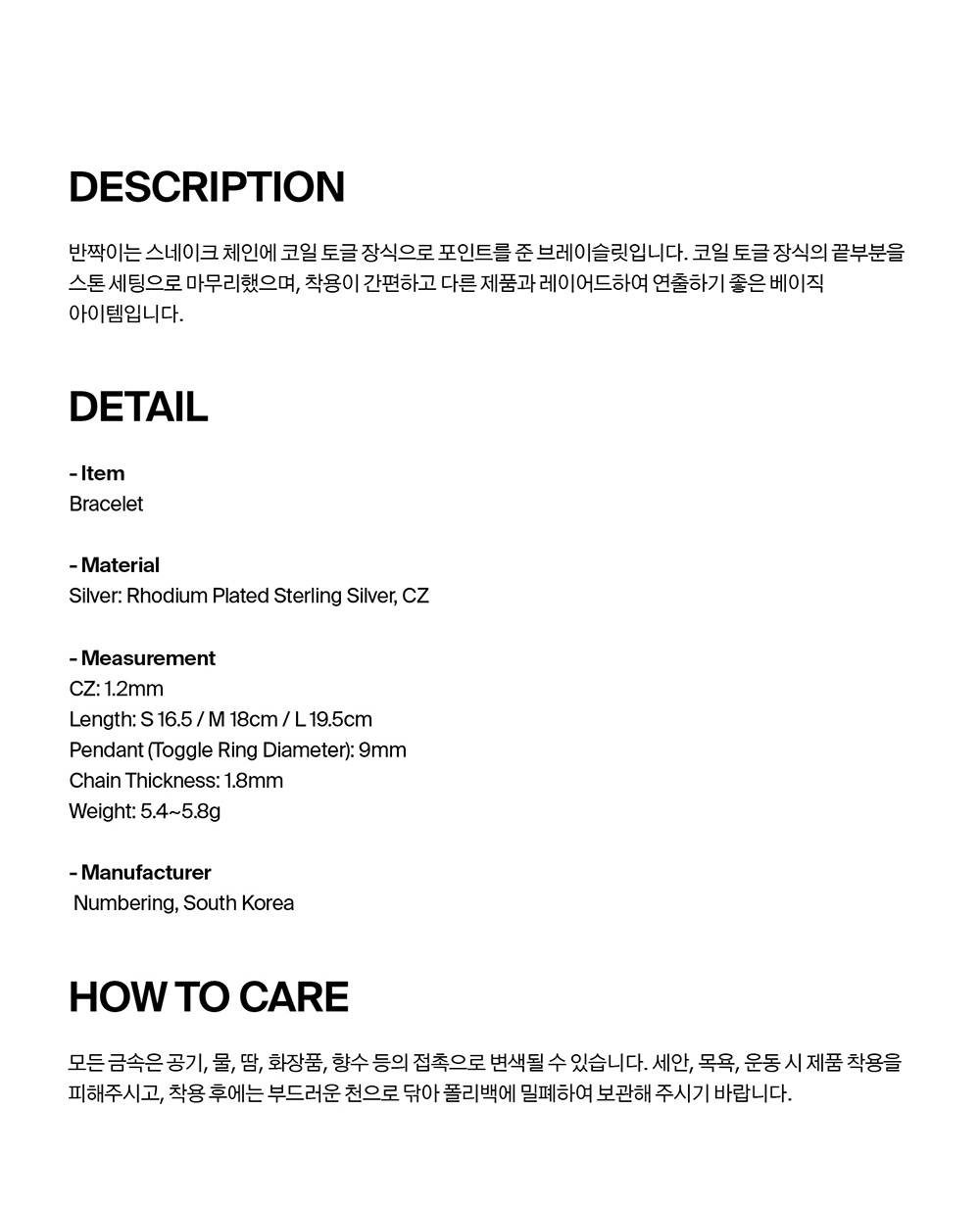 넘버링 #8901 코일 토글 스네이크 체인 브레이슬릿 실버