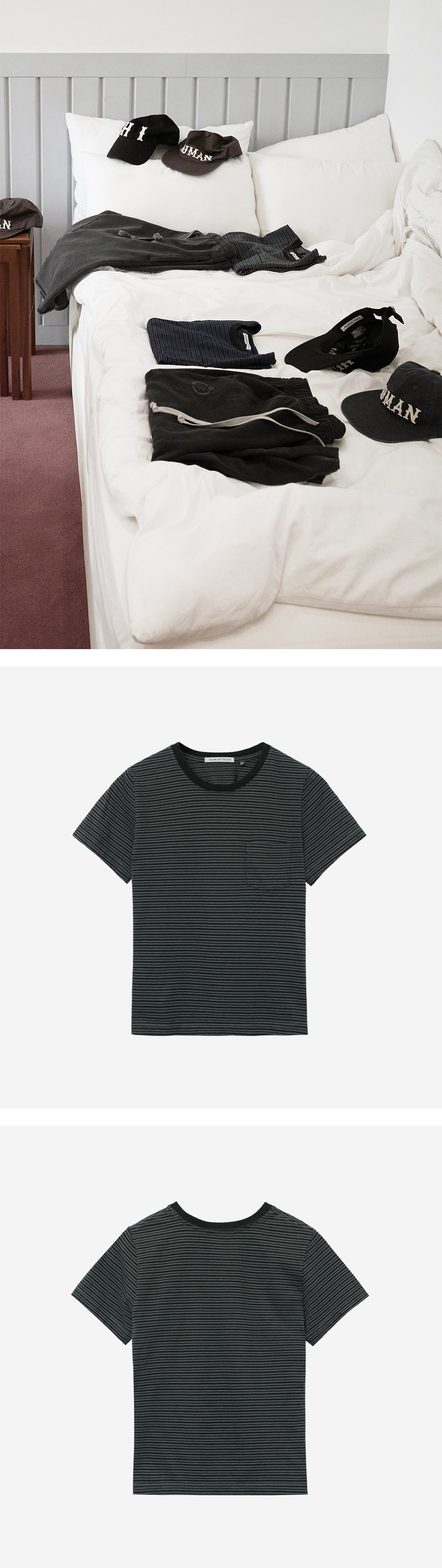 (W) Human Striped Pocket 1/2 T-Shirt Green - 부드러운 촉감의 코튼 티셔츠 - 2가지 두께의 얇은 스트라이프 패턴 - 넉넉하되 다소 핏하게 떨어지는 실루엣 - 가먼트 워싱 및 어깨 체인스티칭 *모델: 170 초반 / 마른 체형, 1사이즈 착용 *가먼트 다잉 제품 특성상 생산 차수마다 색감이 조금씩 변경 될 수 있습니다. *최초 발매 차수로, 전 차수와의 색감차에 대한 코멘트 없이 발매됩니다.
