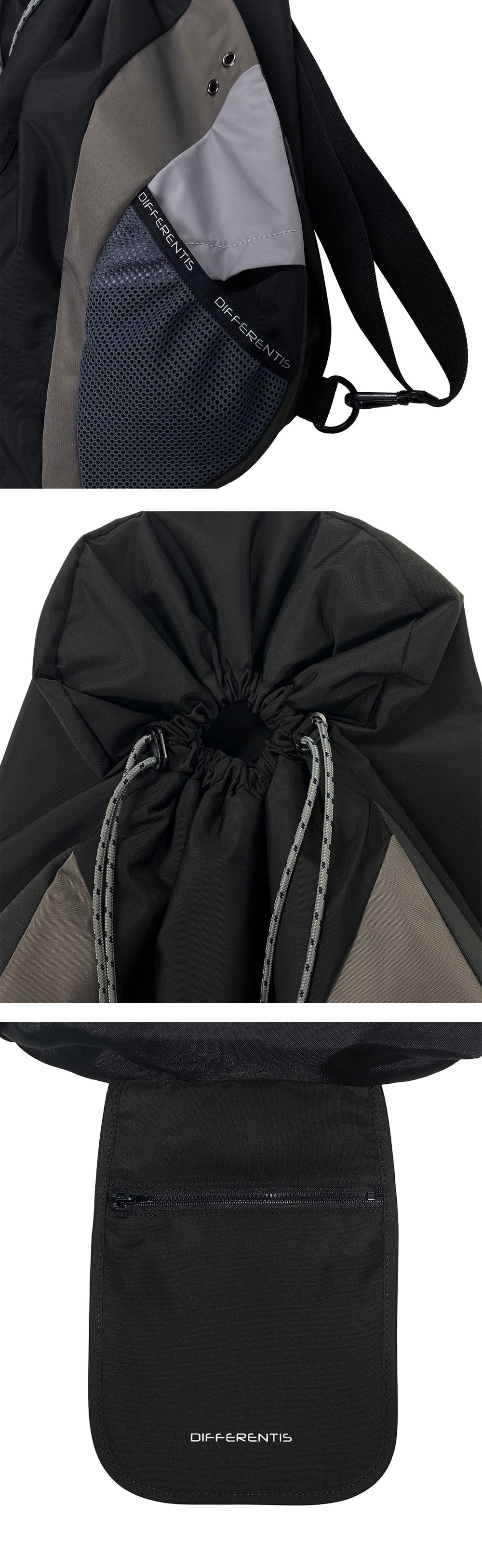 가벼운 무게감의 캐주얼 슬링 백. 다양한 소재과 컬러 배색 디테일. 내부 주머니 디테일, 로고 프린트 테잎. 입구 스트링 배색 디테일.