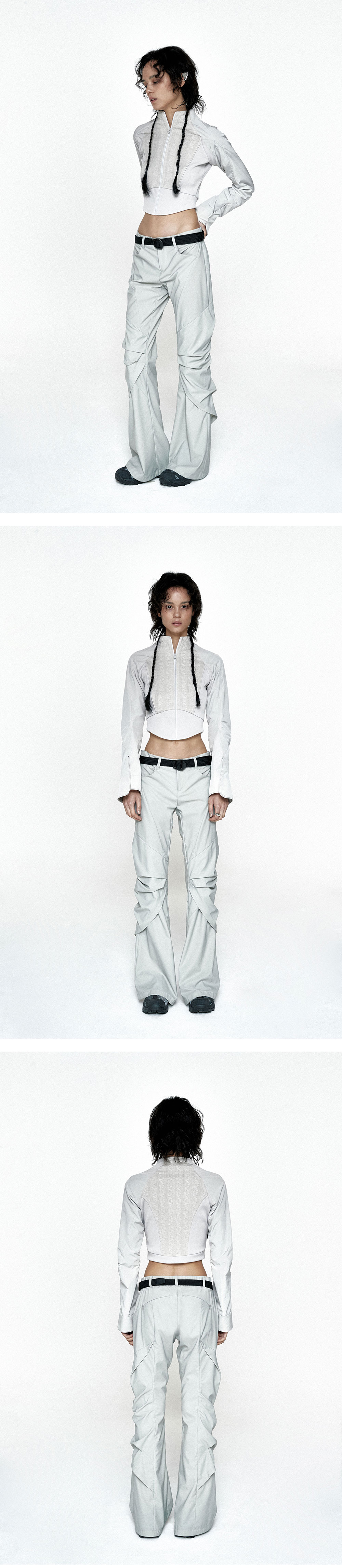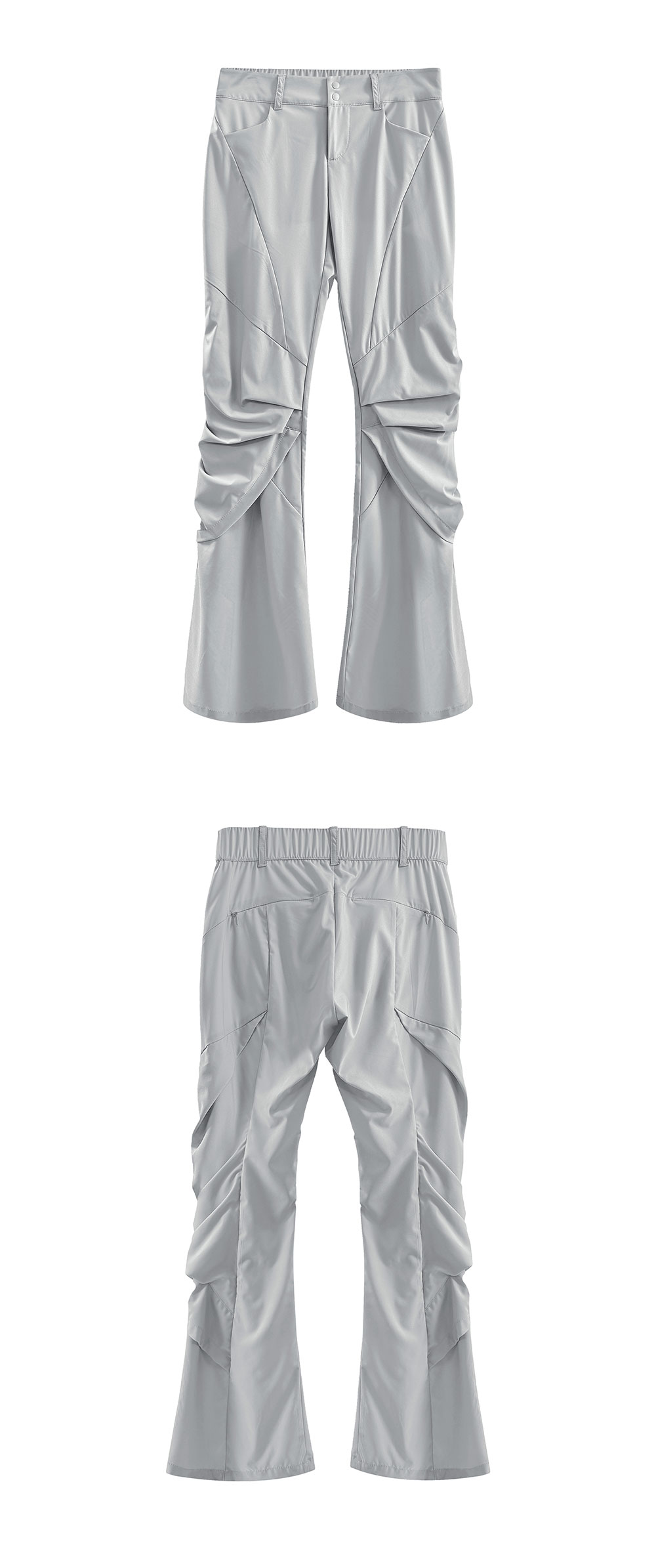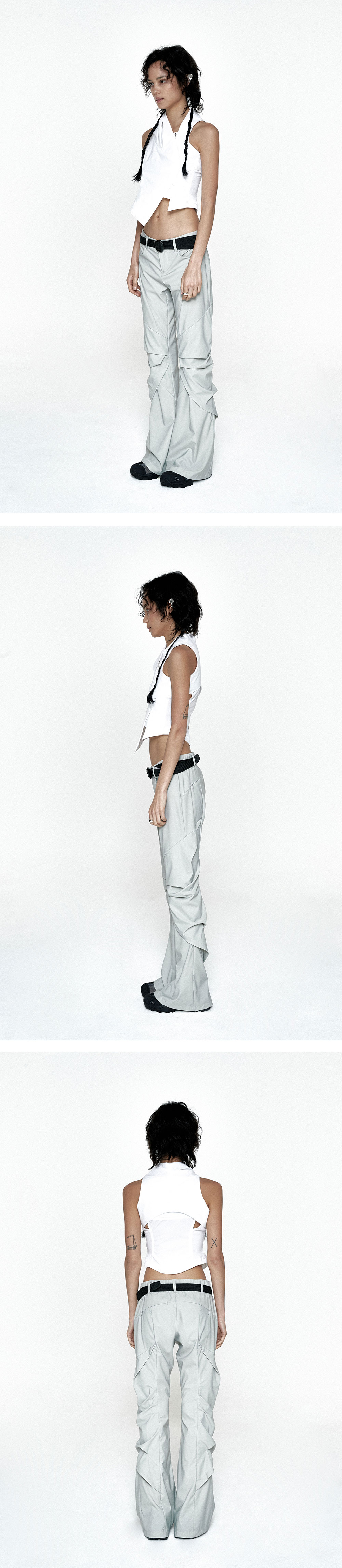 드레이프 실루엣 여성용 세미부츠컷 팬츠. 기능성 나일론 고신축 원단, 뒤허리 밴드 내장. YKK 콘솔 백포켓.