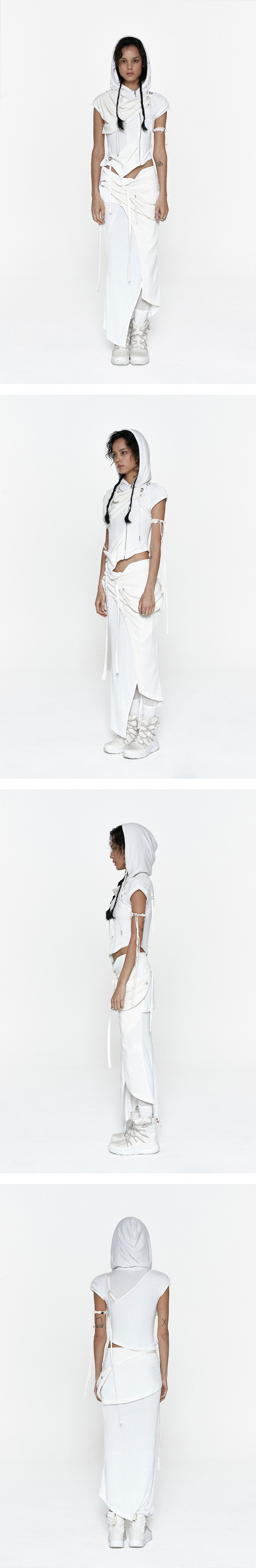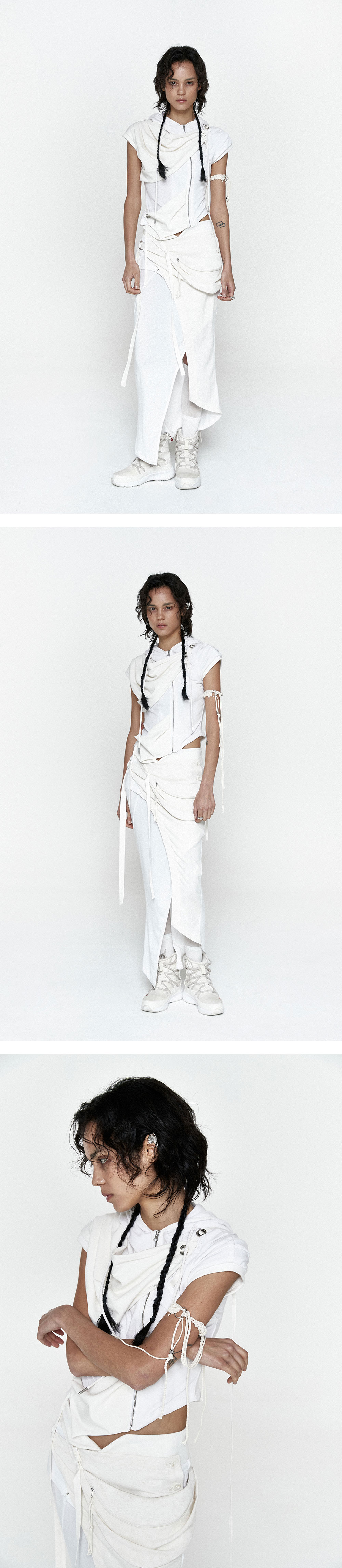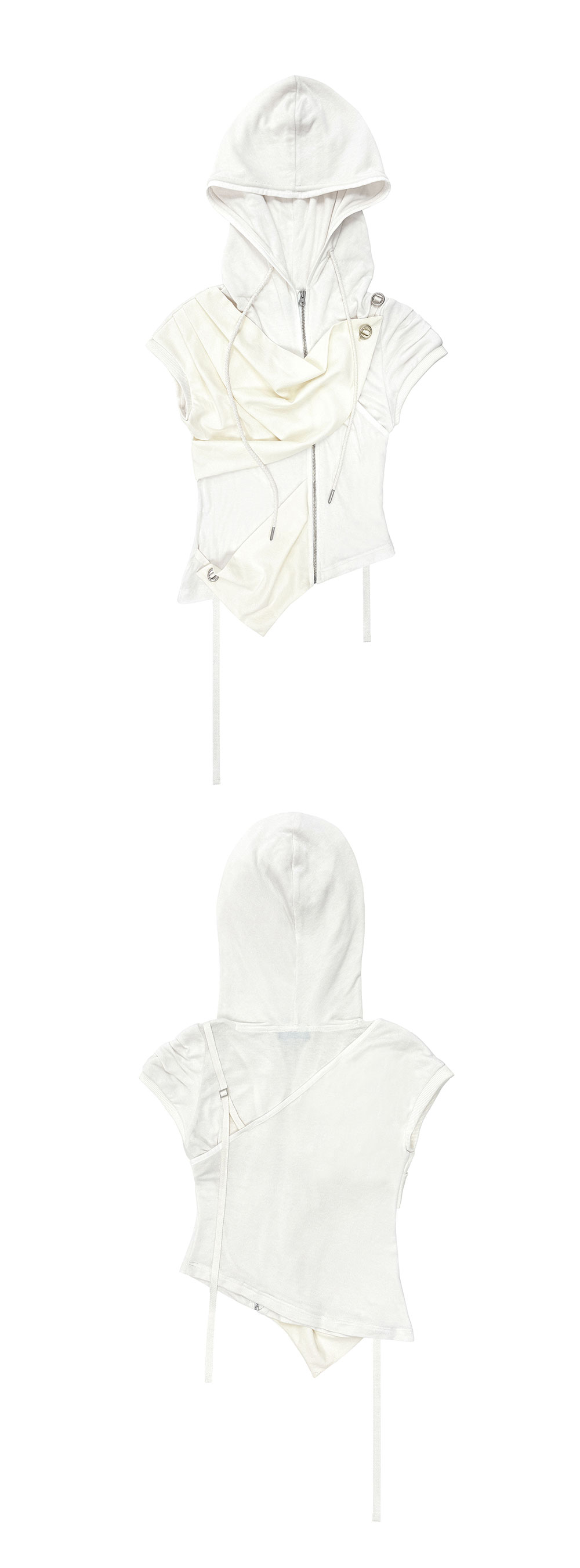 드레이프 레이어링 패널 포인트 집업 후드 탑. 어깨, 사이드의 단추와 스트랩으로 핏 조절. 전면 YKK 니켈 지퍼 여밈. 드레이프 비대칭 소매, 비대칭 밑단. 항균 원사 사용으로 부드럽고 쾌적한 착용감. 리넨합성 소재 배색. 후드 스트링 내장.