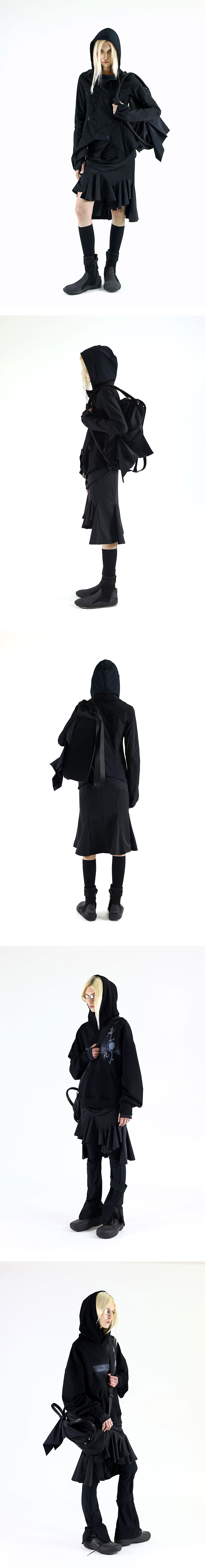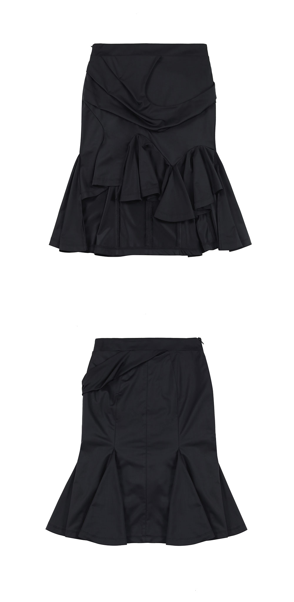 트리코트 스트레치 소재의 플레어 스커트. 드레이프 레이어링 패널 디테일. 비대칭 플레어 밑단 디자인. 고신축 TR스판 속치마 내장.