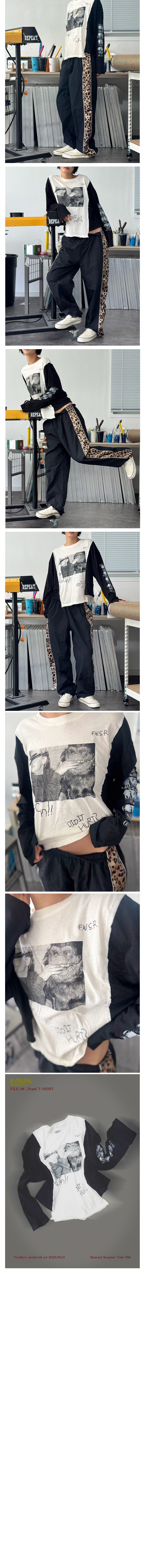 불완전한 구조, 충돌, 감각적 오류를 그대로 드러냅니다. 전면에는 한 소년과 공룡의 위태로운 교차점, 그리고 “OUCH!”, “DID IT HURT?”라는 타이포그래피가 거칠게 쓰였습니다. 왼팔 전체에는 스캔된 듯 반복된 이미지 타이포가 실크스크린으로 인쇄되어 움직임 속에서 끊임없이 이야기를 반복합니다. 입었을 때 시선이 머무르는 곳곳에 작은 충격이 숨겨져 있습니다. ✔ 블랙 슬리브 + 화이트 바디의 언밸런스 배색 ✔ 레이어드용 또는 단품 착용 모두 적합 ✔ 밑단 컷팅 마감, 러프한 마무리 처리 ✔ 세탁할수록 컷팅부분이 러프하게 말리는 현상을 즐겨주세요. ✔ 옆선 앞선 길이가 다릅니다. ✔ 얇은 40수원단 입니다.비침이 살짝 있습니다.