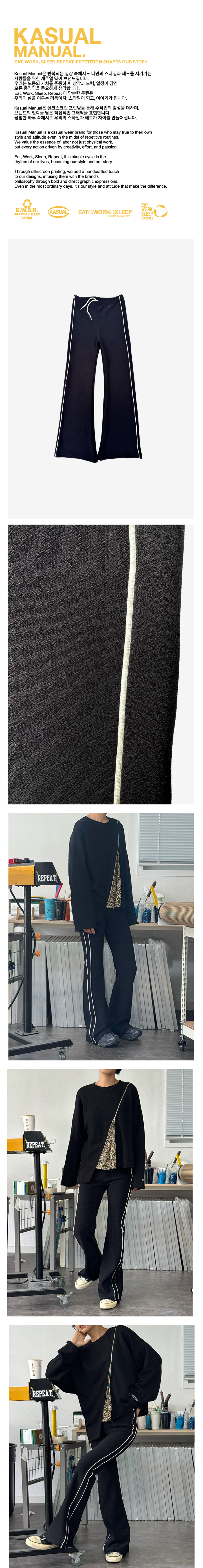 측면의 오묘하게 비틀린 싱글 파이핑 디테일이 군더더기 없는 실루엣에 리듬을 더합니다. 주름이나 구김에 무심한 태도로, 매일 반복되는 일상에 조금은 다른 리듬을 부여합니다. ✔ 활동성 있는 크레이프 터치 원단 ✔ 허리 전체 밴딩 + 스트링 내장 ✔ 전/후면 모두 깔끔한 무지 디자인 ✔ 플레어핏 팬츠로 다리라인 슬림하게 연출 ✔ 옆라인 2줄 파이핑 아이 색상