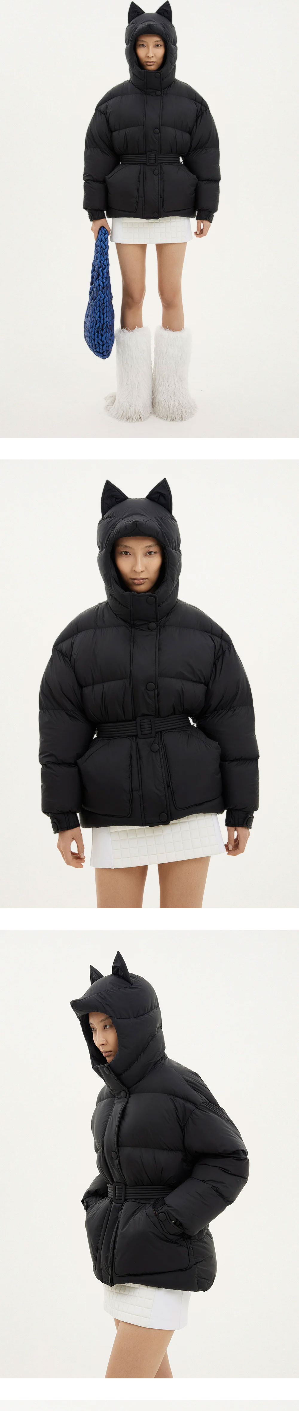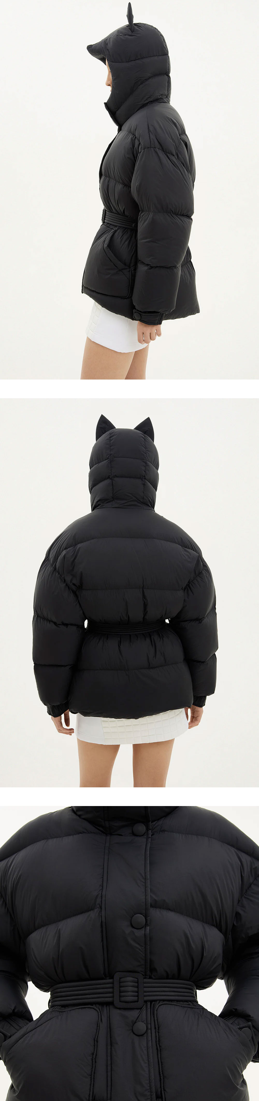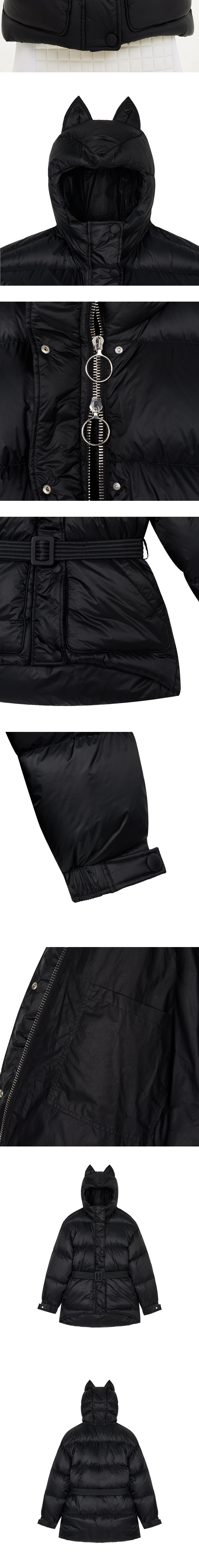 여우 귀가 포인트인 옌키 옌키 우먼 폭스 미쉐린 레온 블랙입니다. - 발수 및 방풍 기능성 원단 - 내부 포켓 2개 - 탈착 가능한 벨트형 허리 디테일 - 실버 컬러의 Riri 하드웨어 사용 - 탈부착 불가능한 고정형 후드