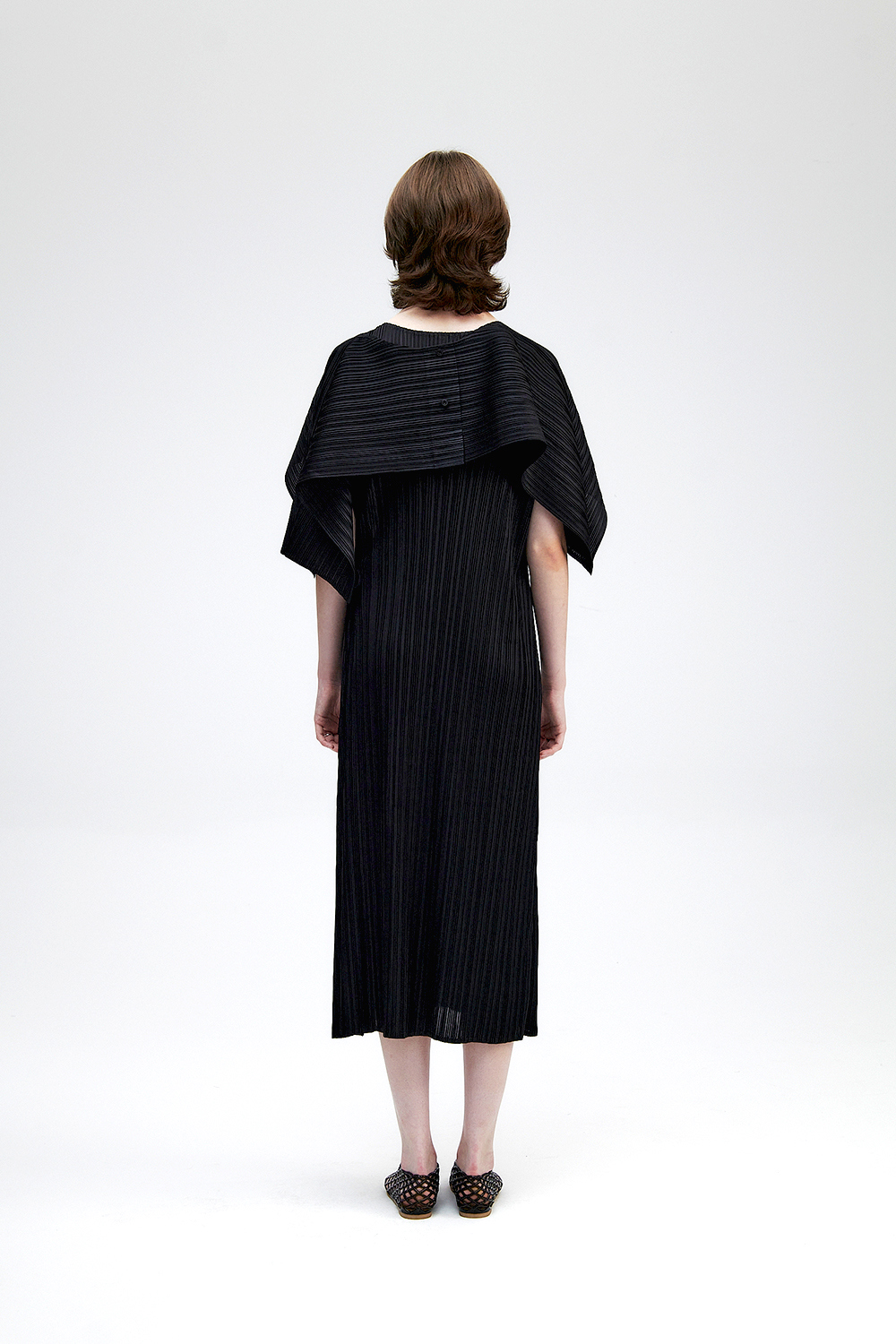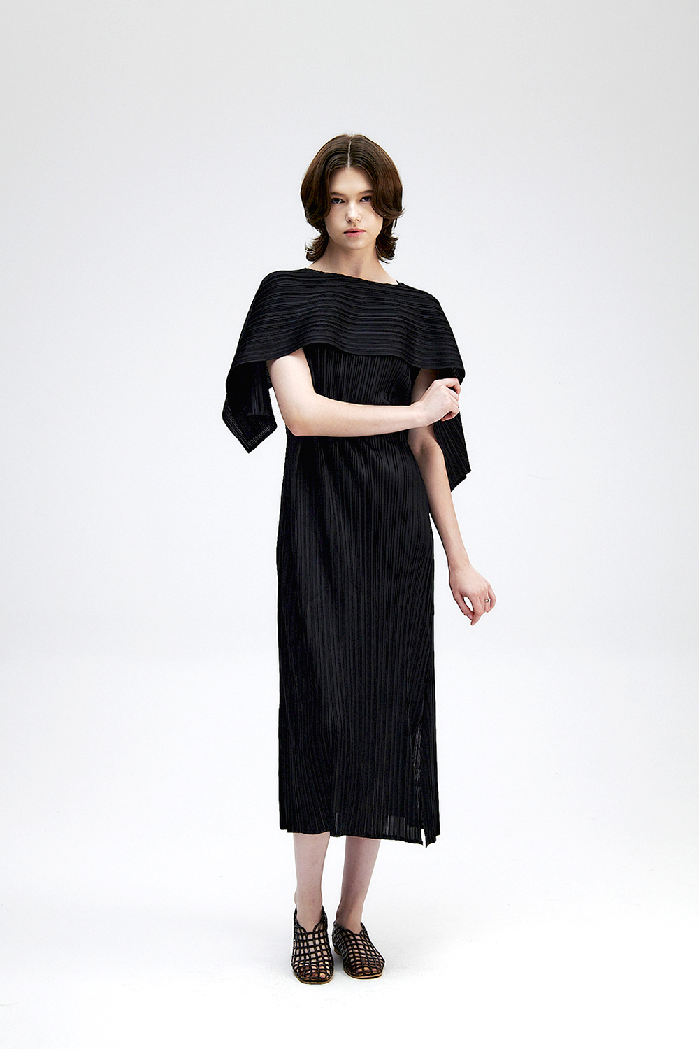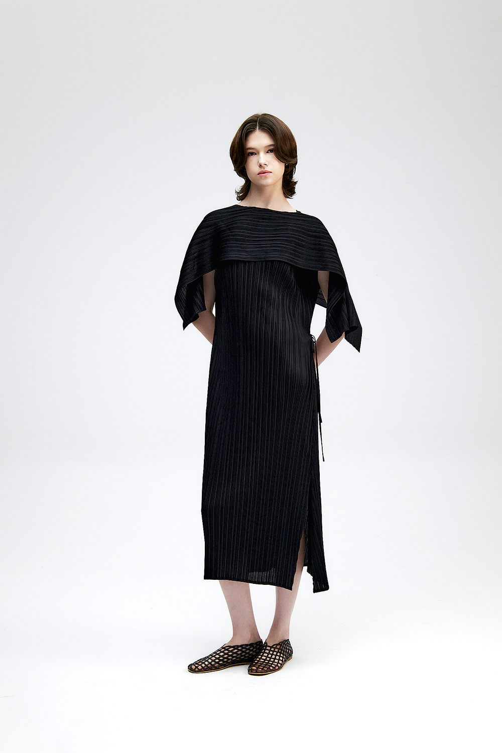 몽플리쎄 여성 바이어스 케이프 캡소매 스트랩 플리츠 원피스 블랙