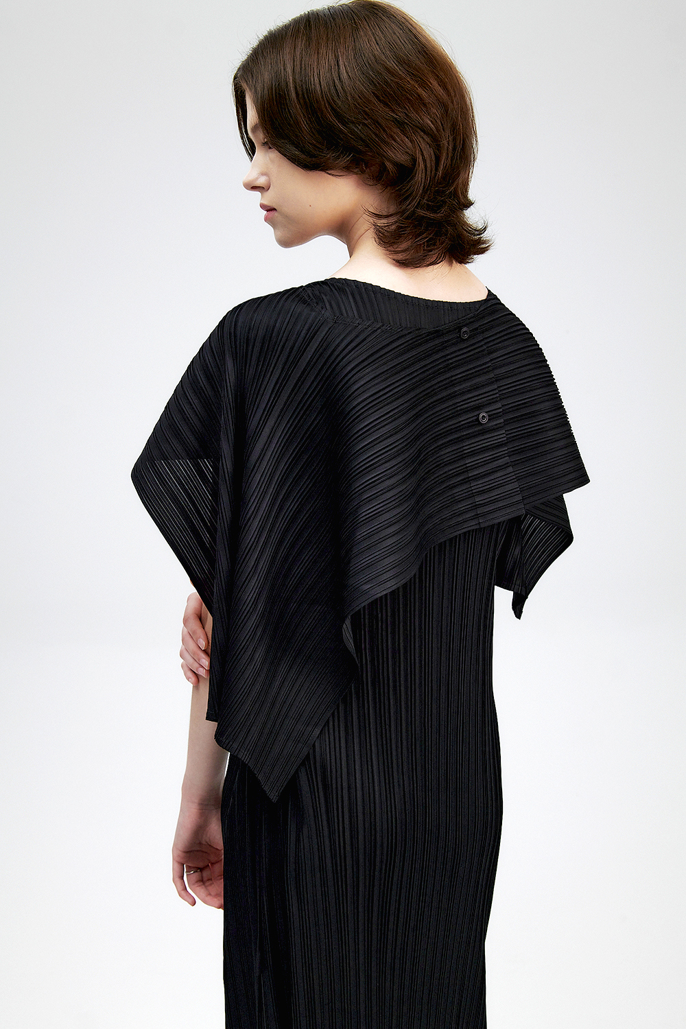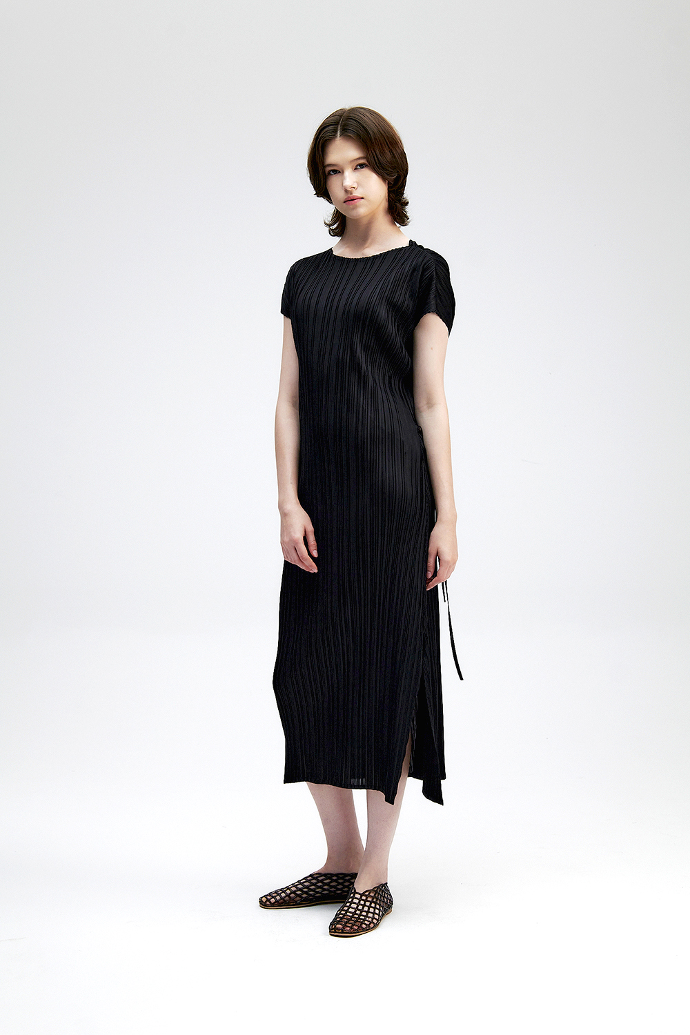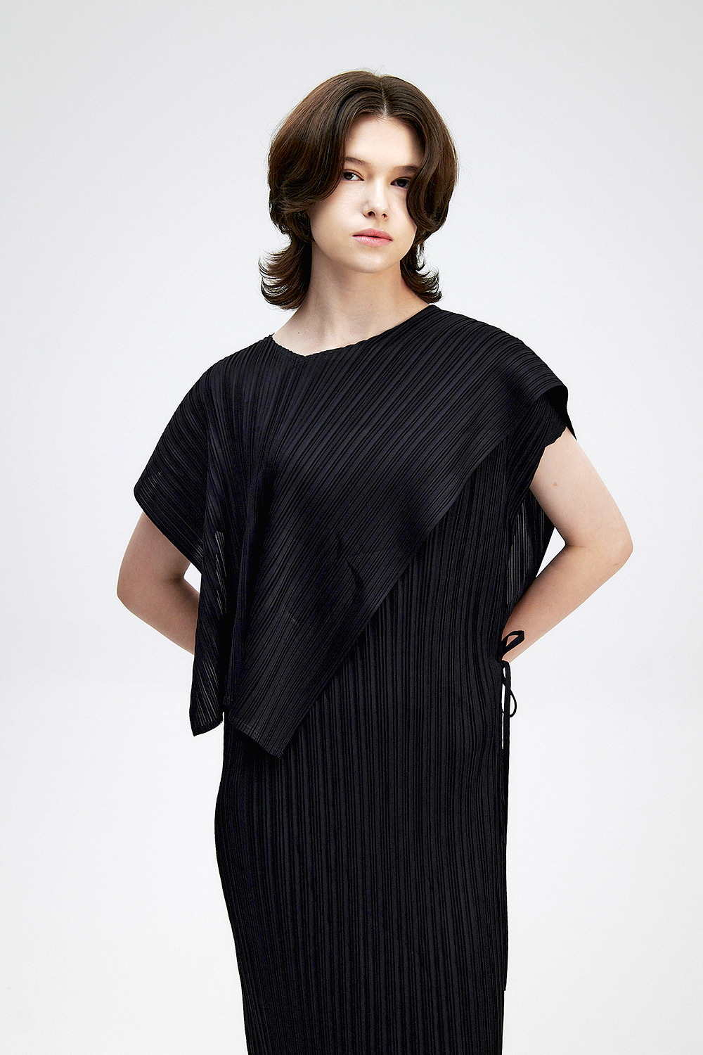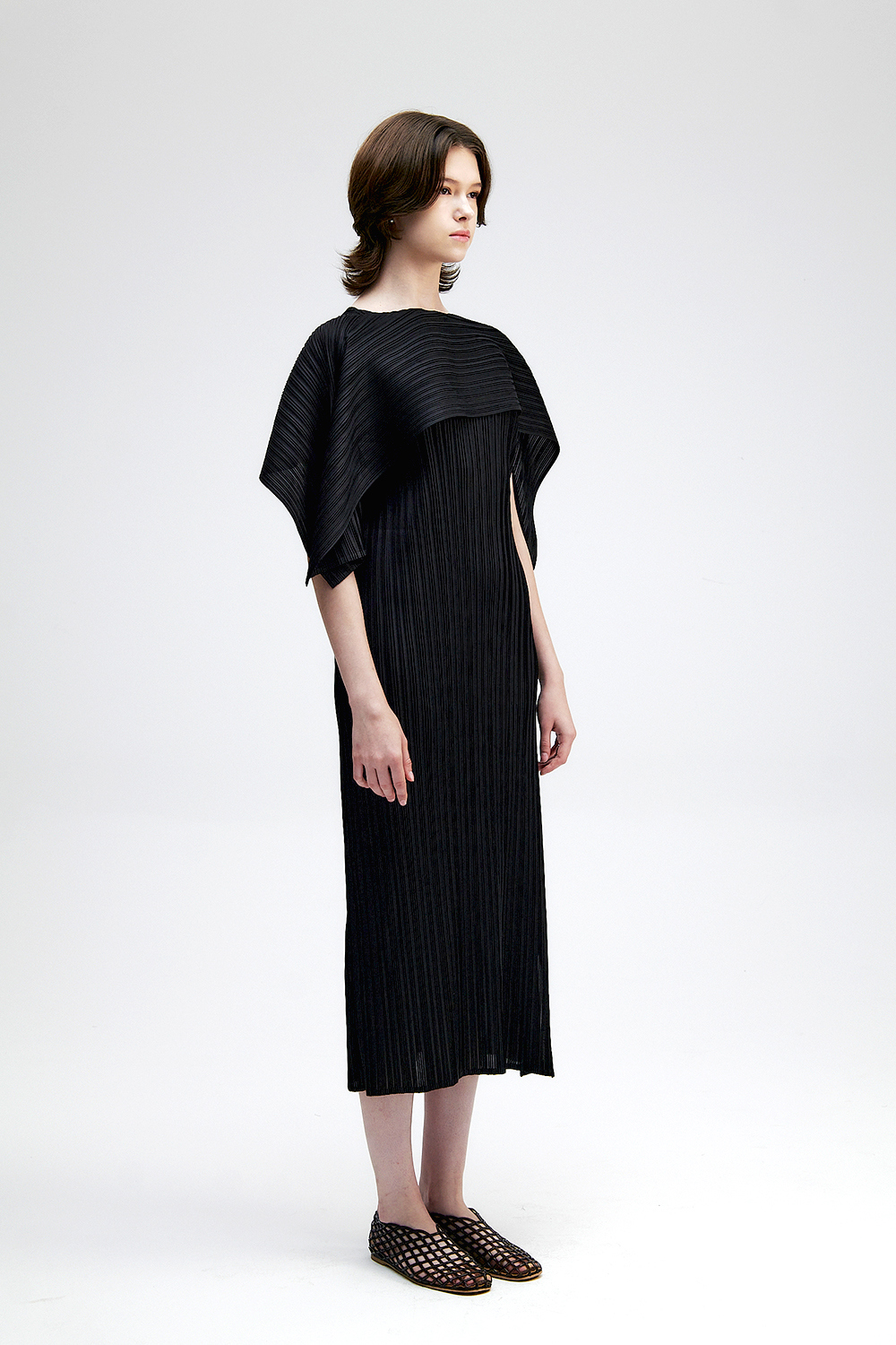 몽플리쎄 여성 바이어스 케이프 캡소매 스트랩 플리츠 원피스 블랙