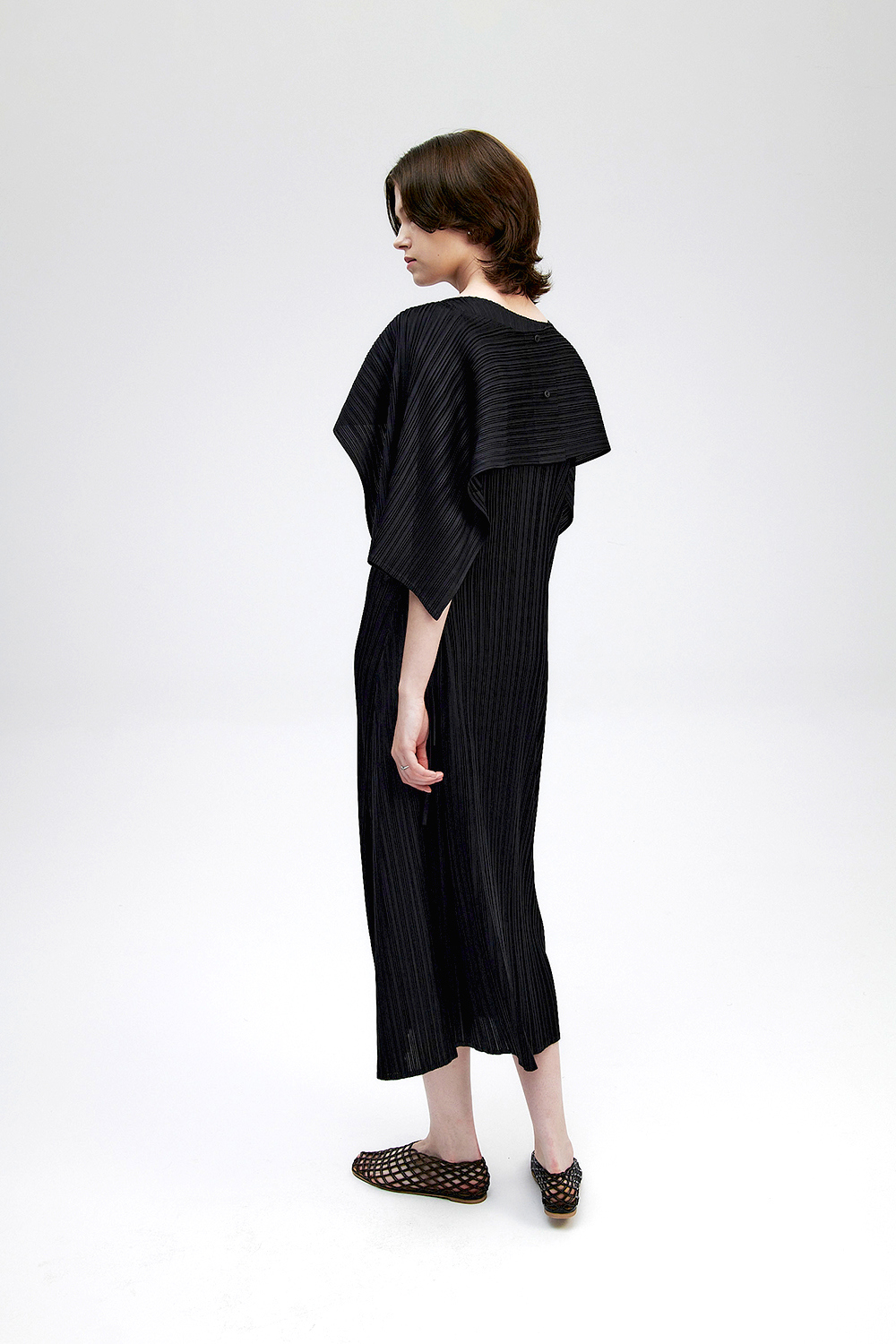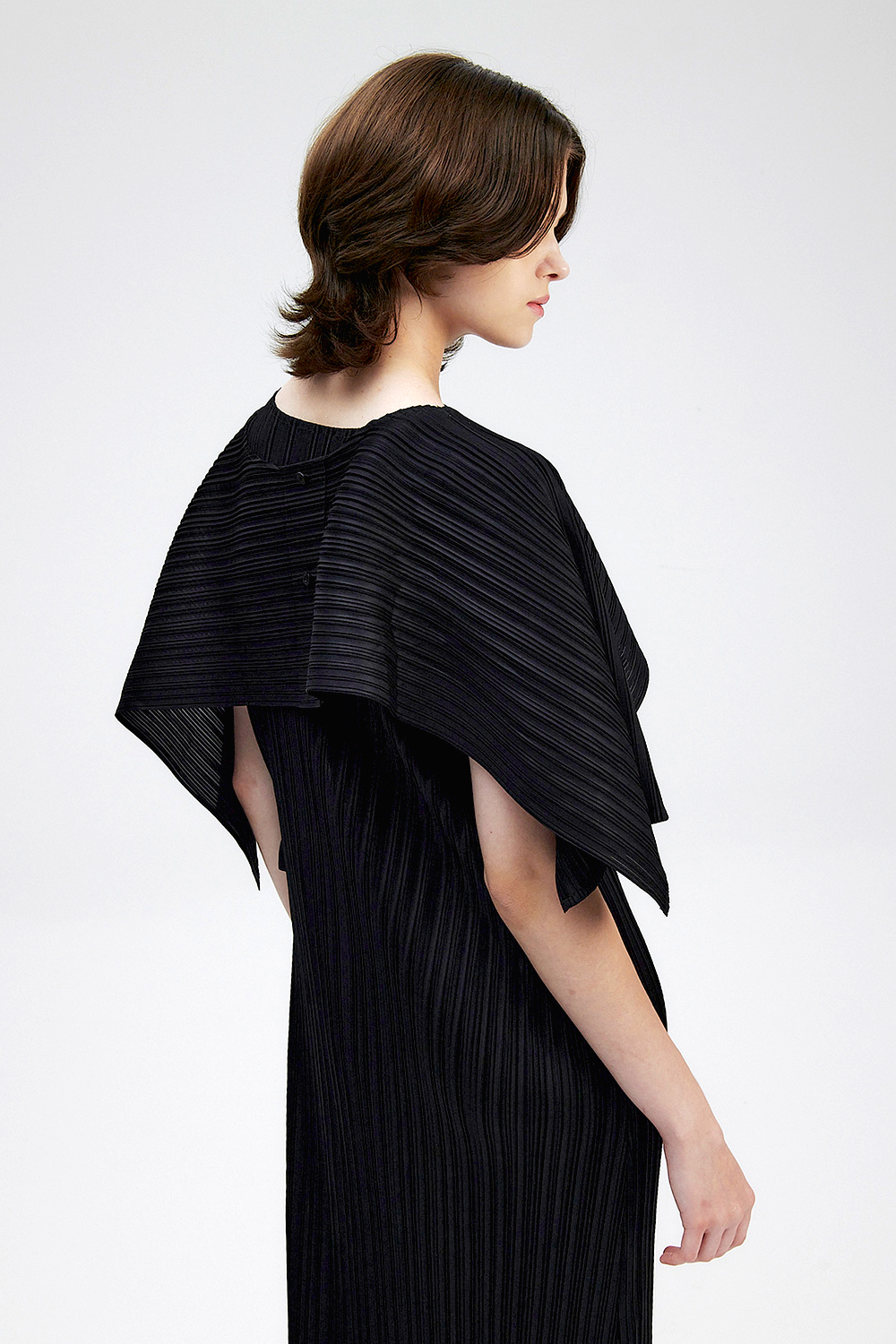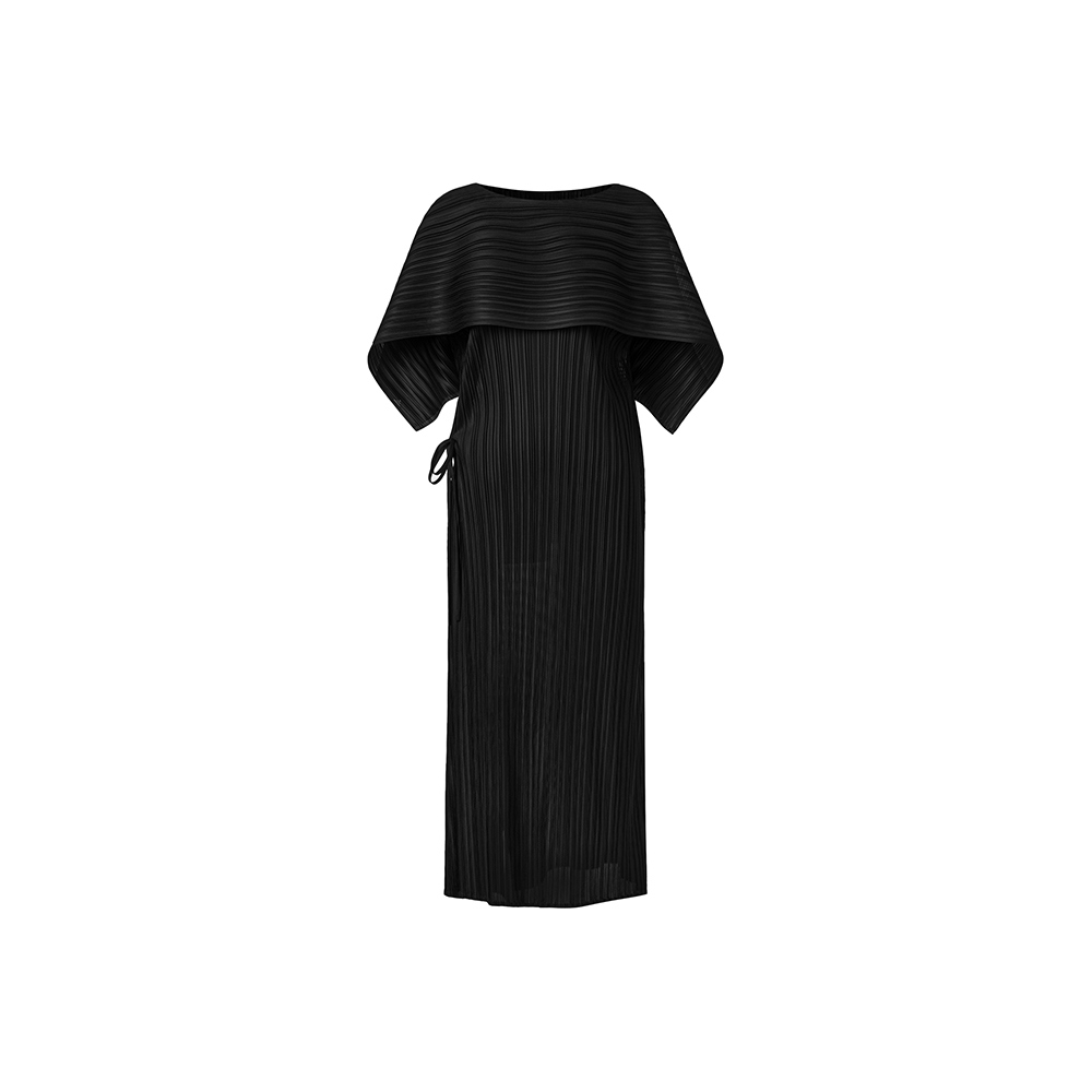 몽플리쎄 여성 바이어스 케이프 캡소매 스트랩 플리츠 원피스 블랙