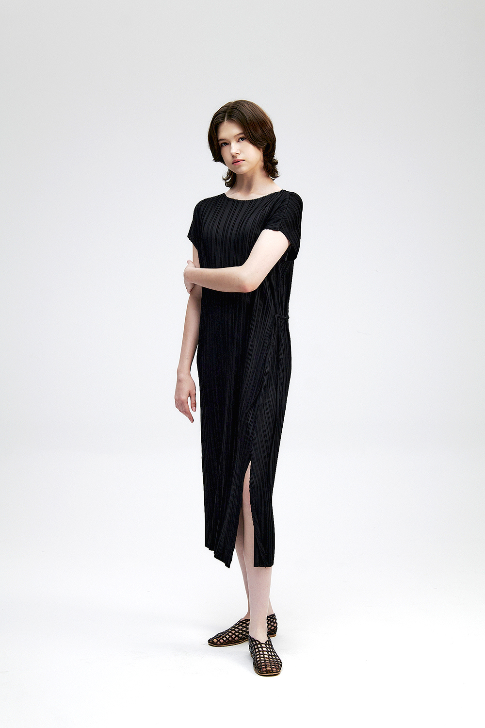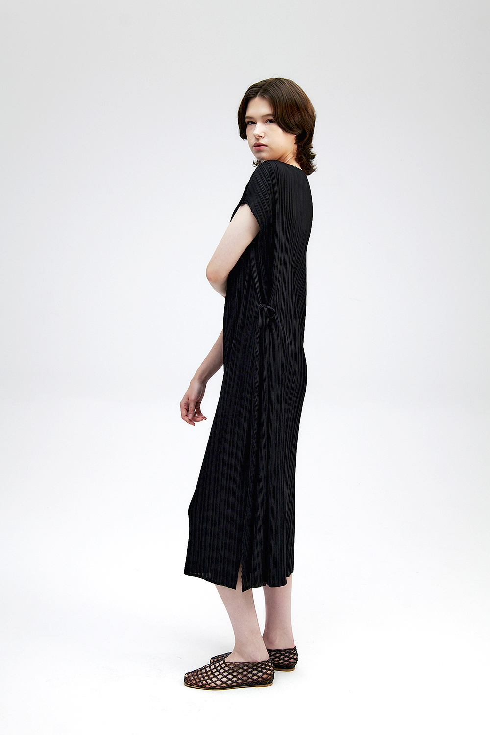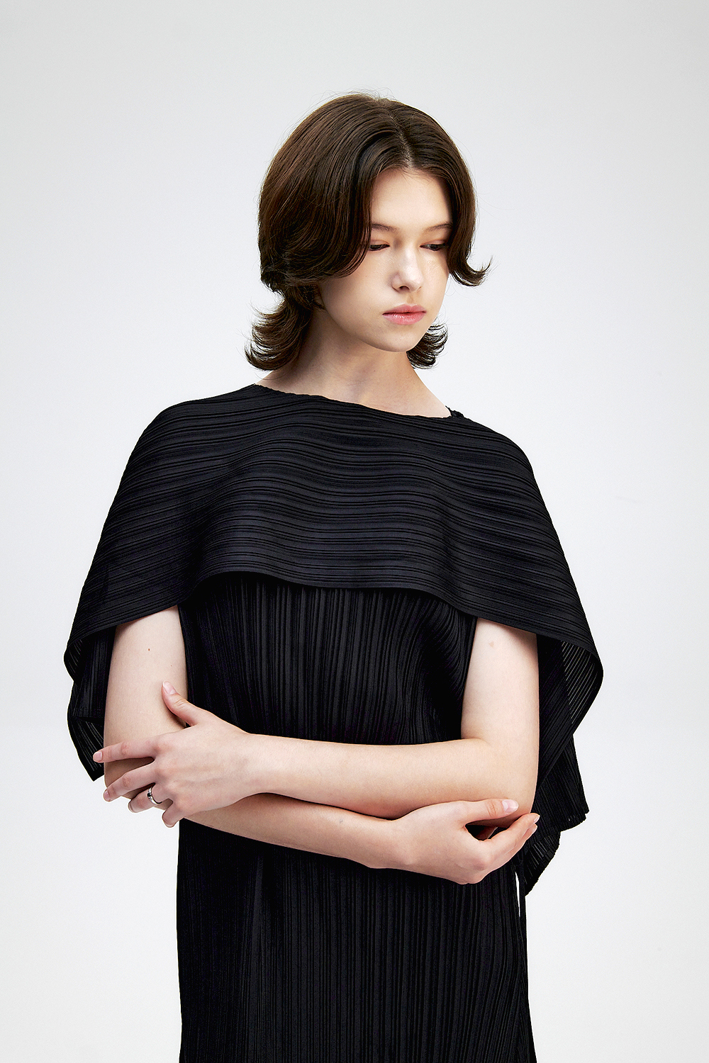 몽플리쎄 여성 바이어스 케이프 캡소매 스트랩 플리츠 원피스 블랙