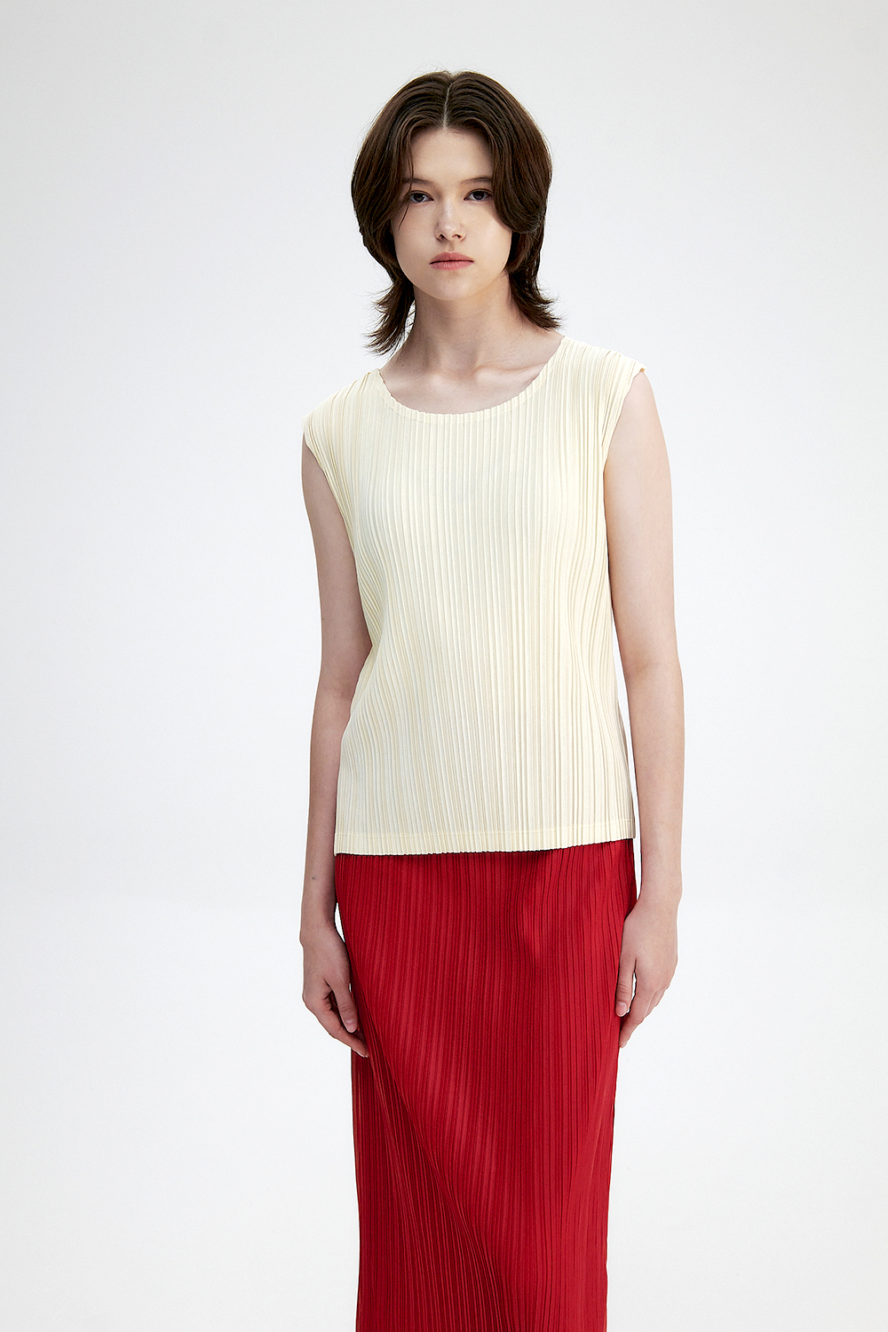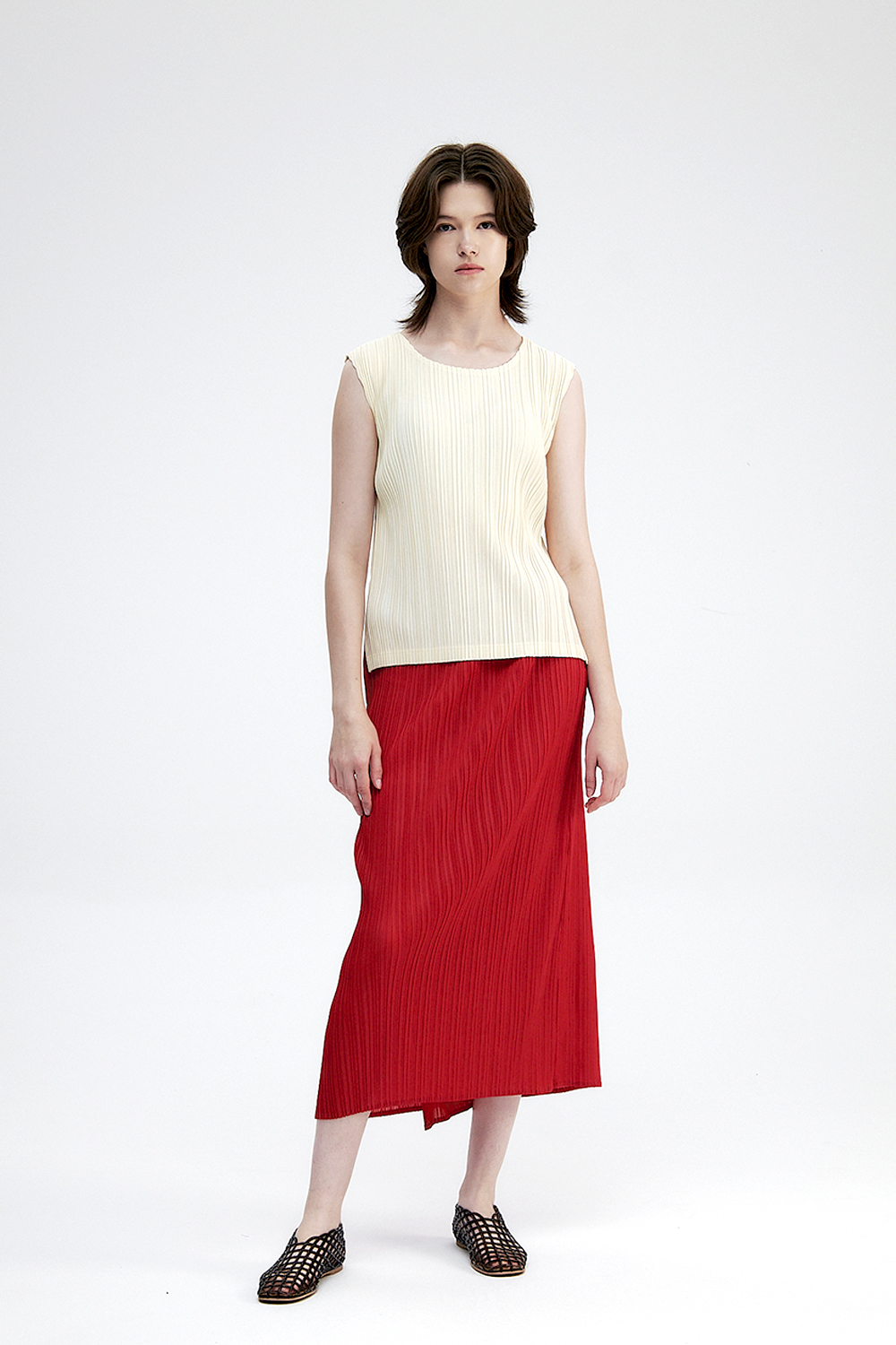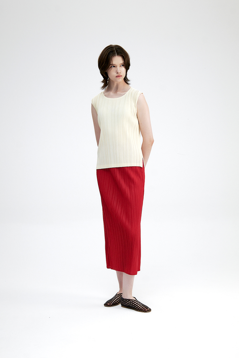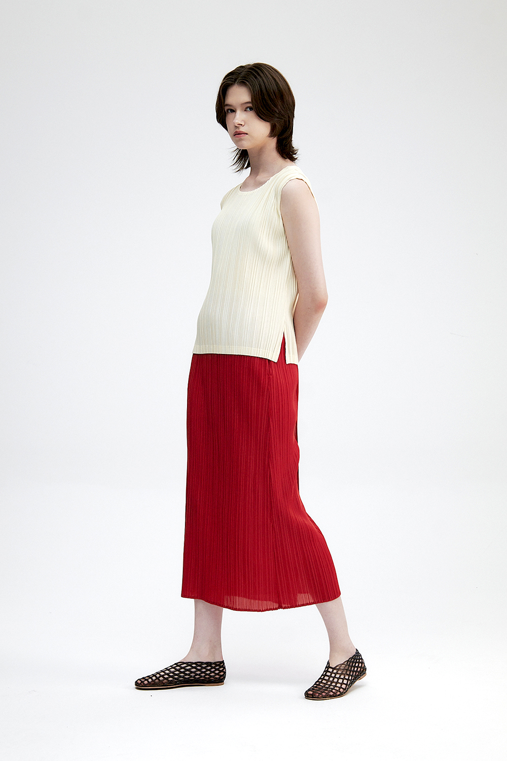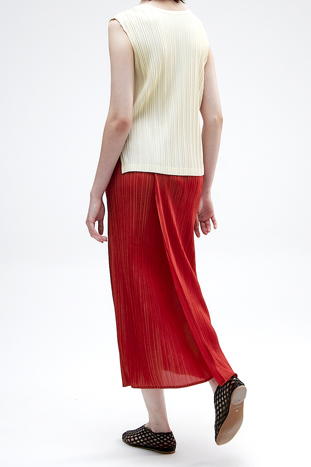몽플리쎄 여성 백 슬릿 H라인 플리츠 롱 스커트 레드