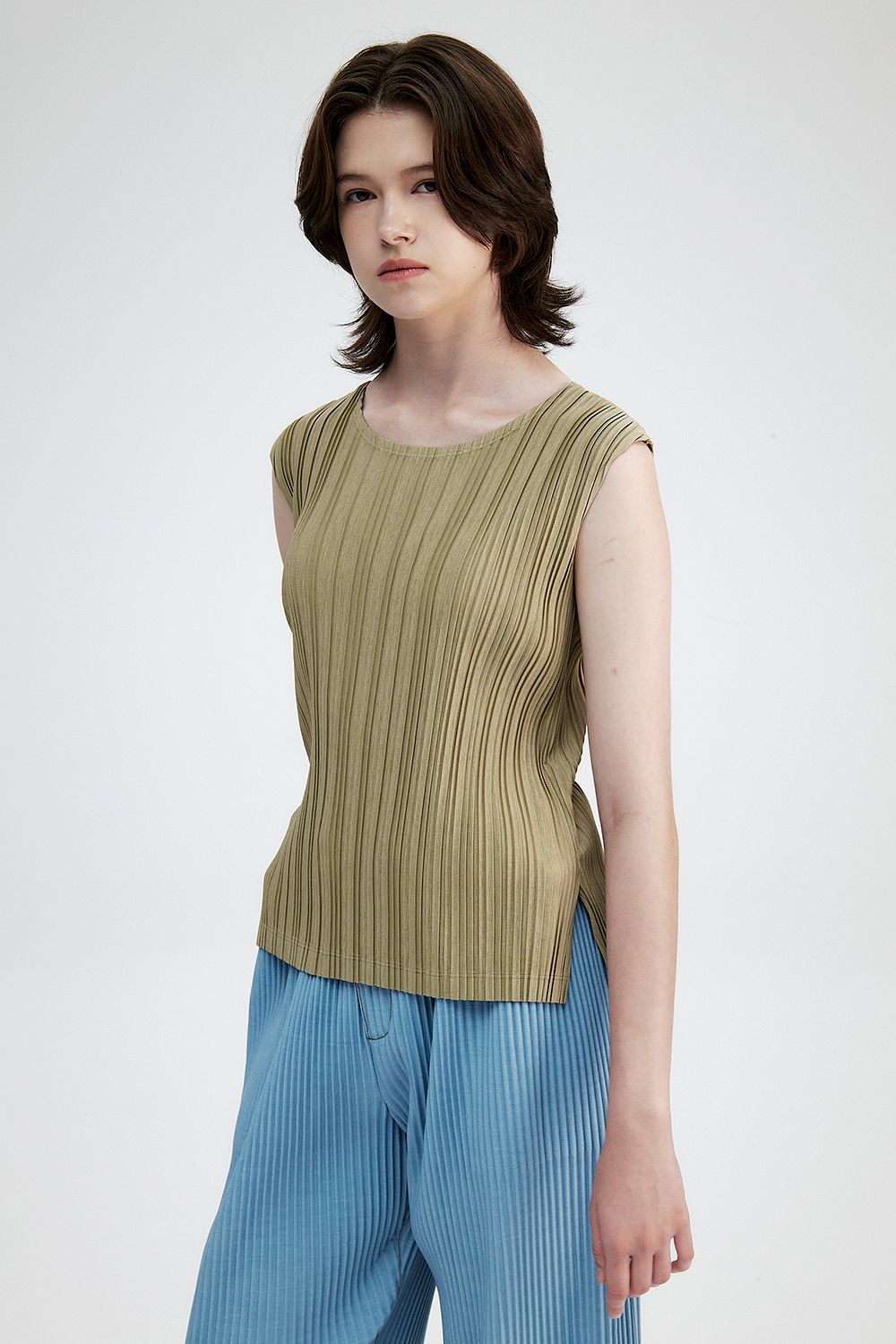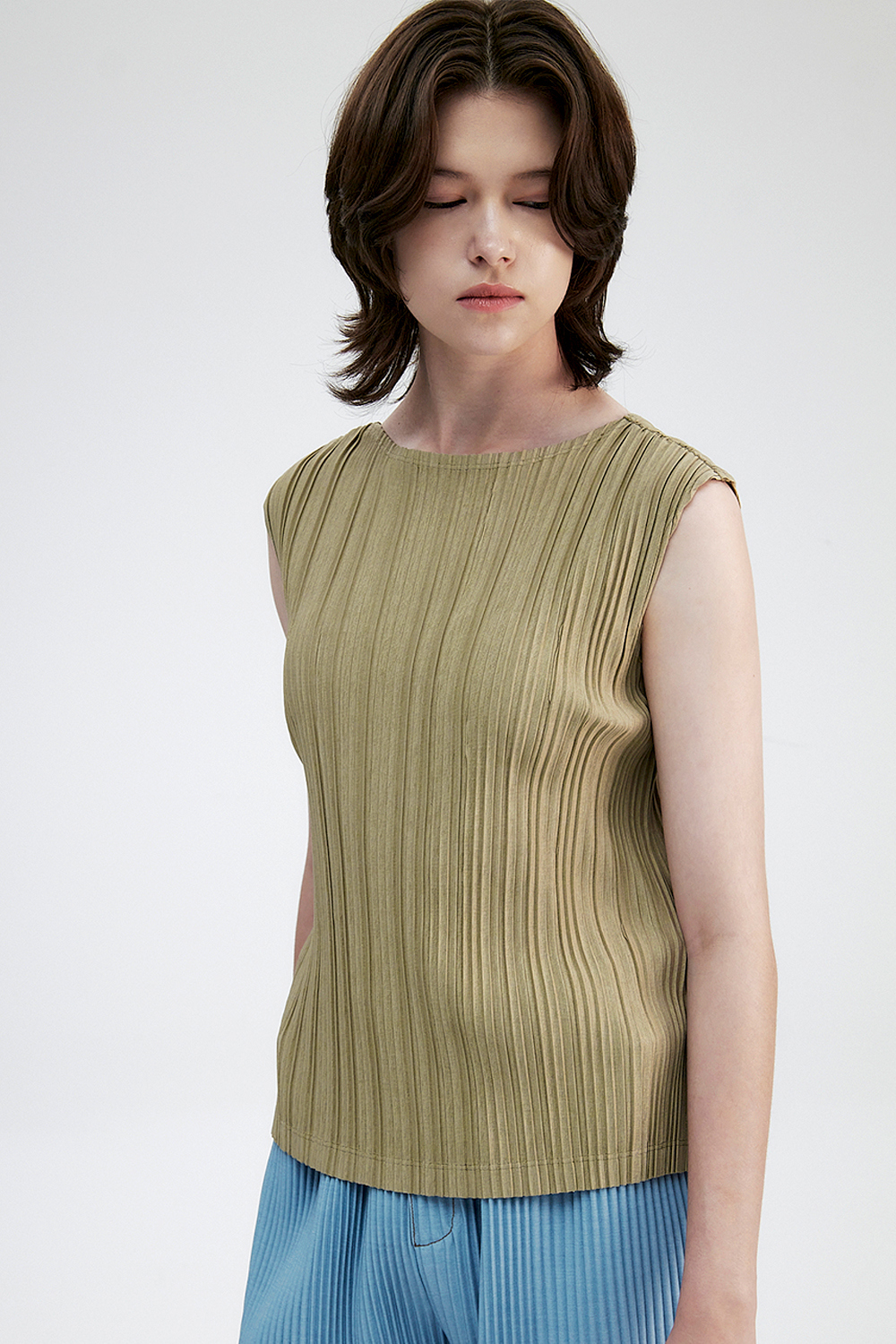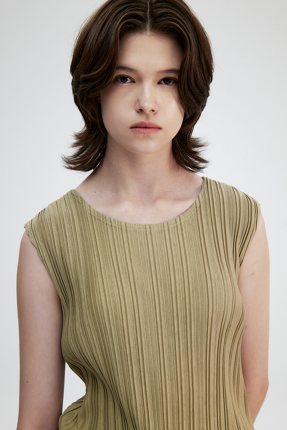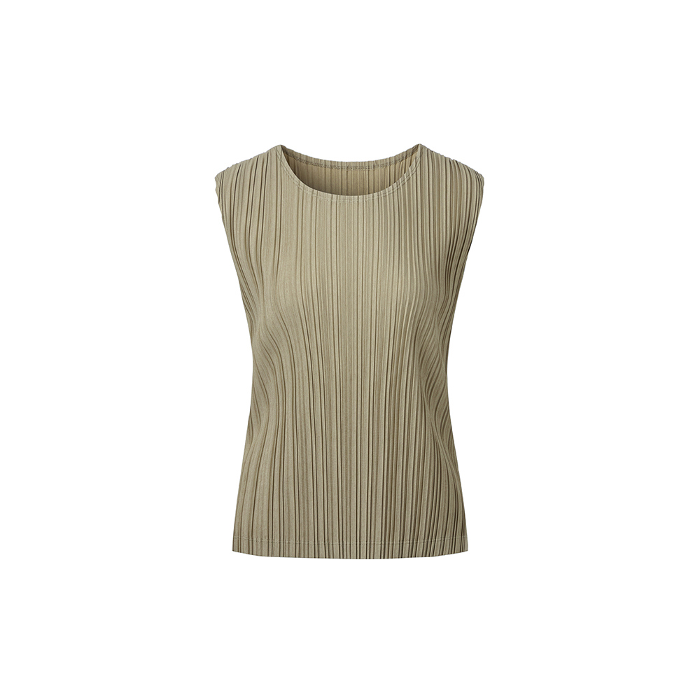 몽플리쎄 여성 투웨이 라운드넥 슬리브리스 저지 플리츠 탑 베이지