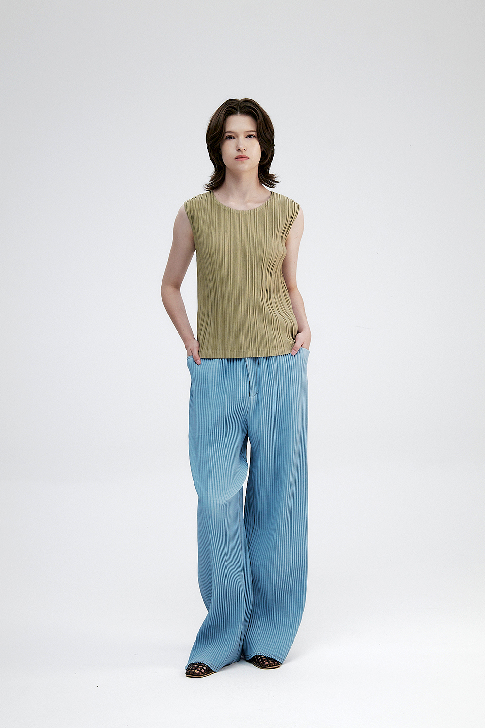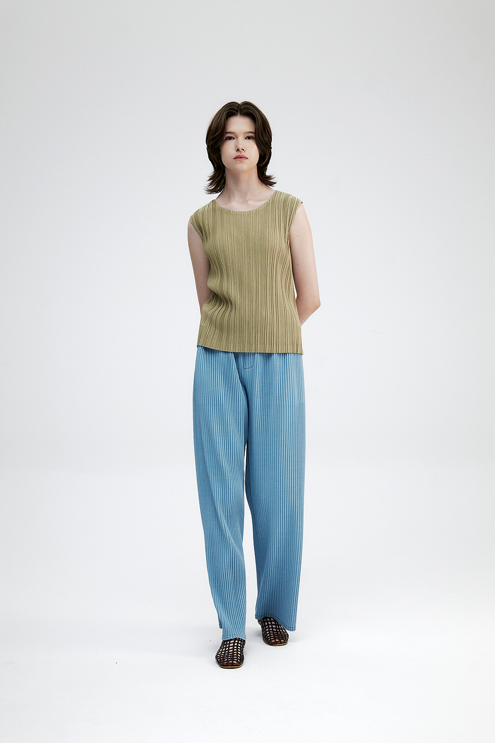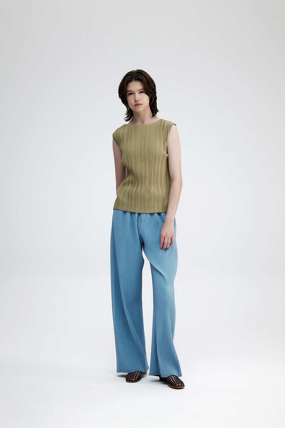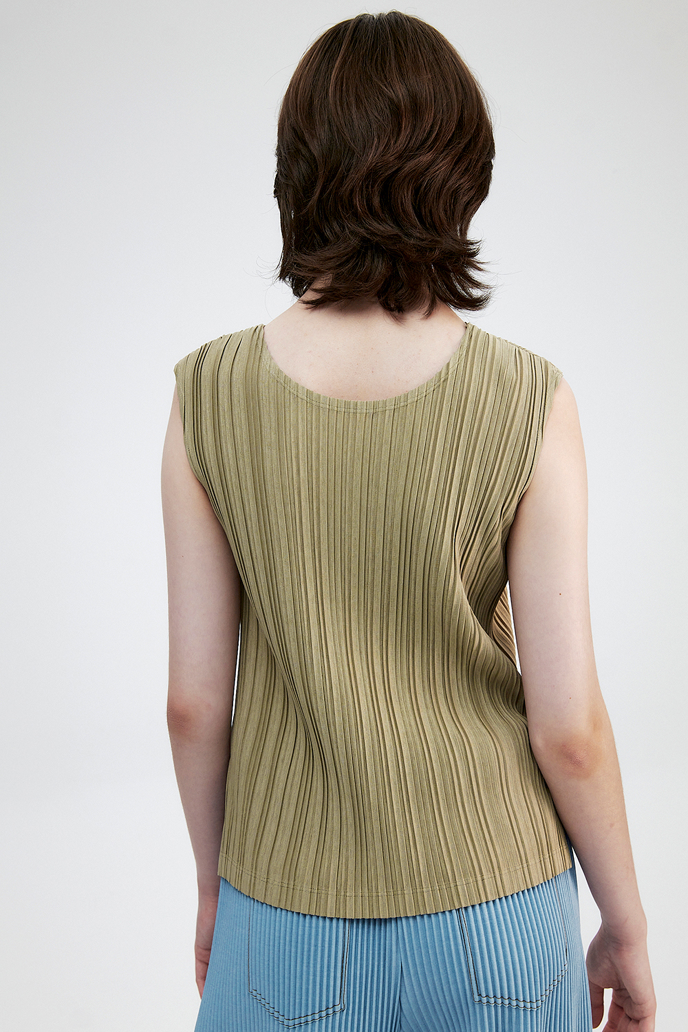 몽플리쎄 여성 투웨이 라운드넥 슬리브리스 저지 플리츠 탑 베이지