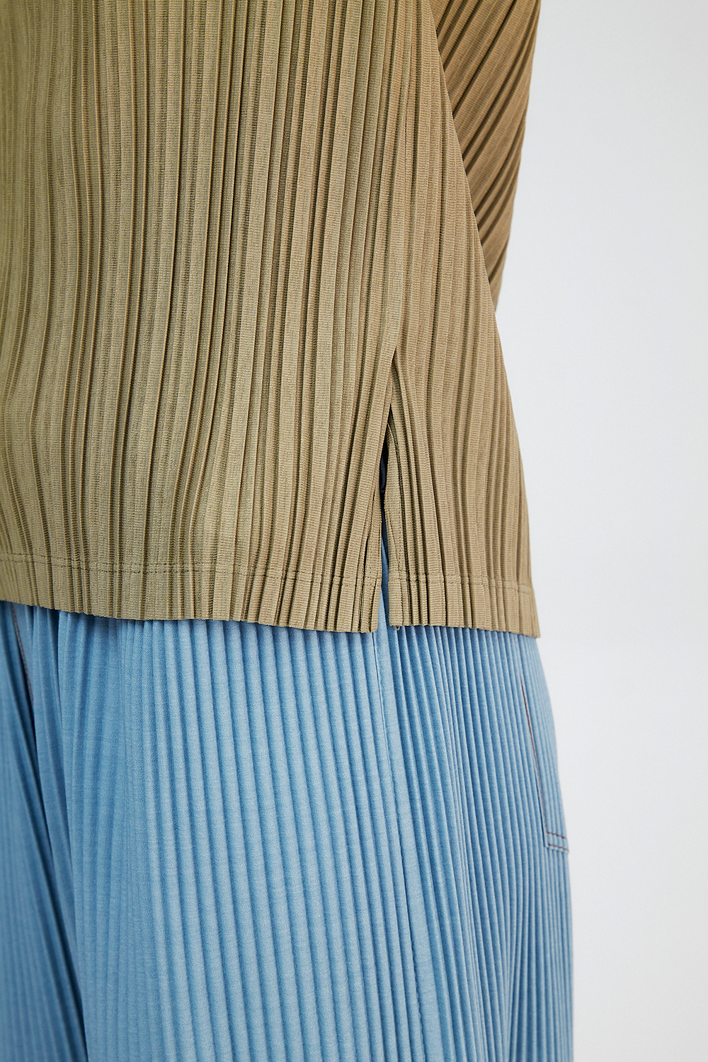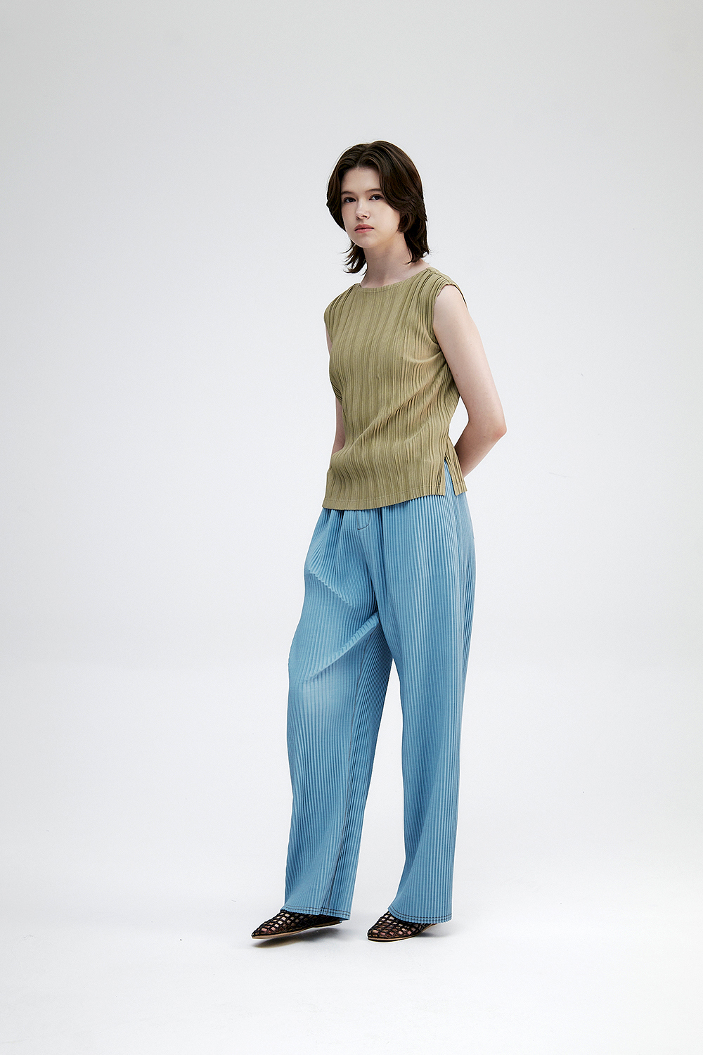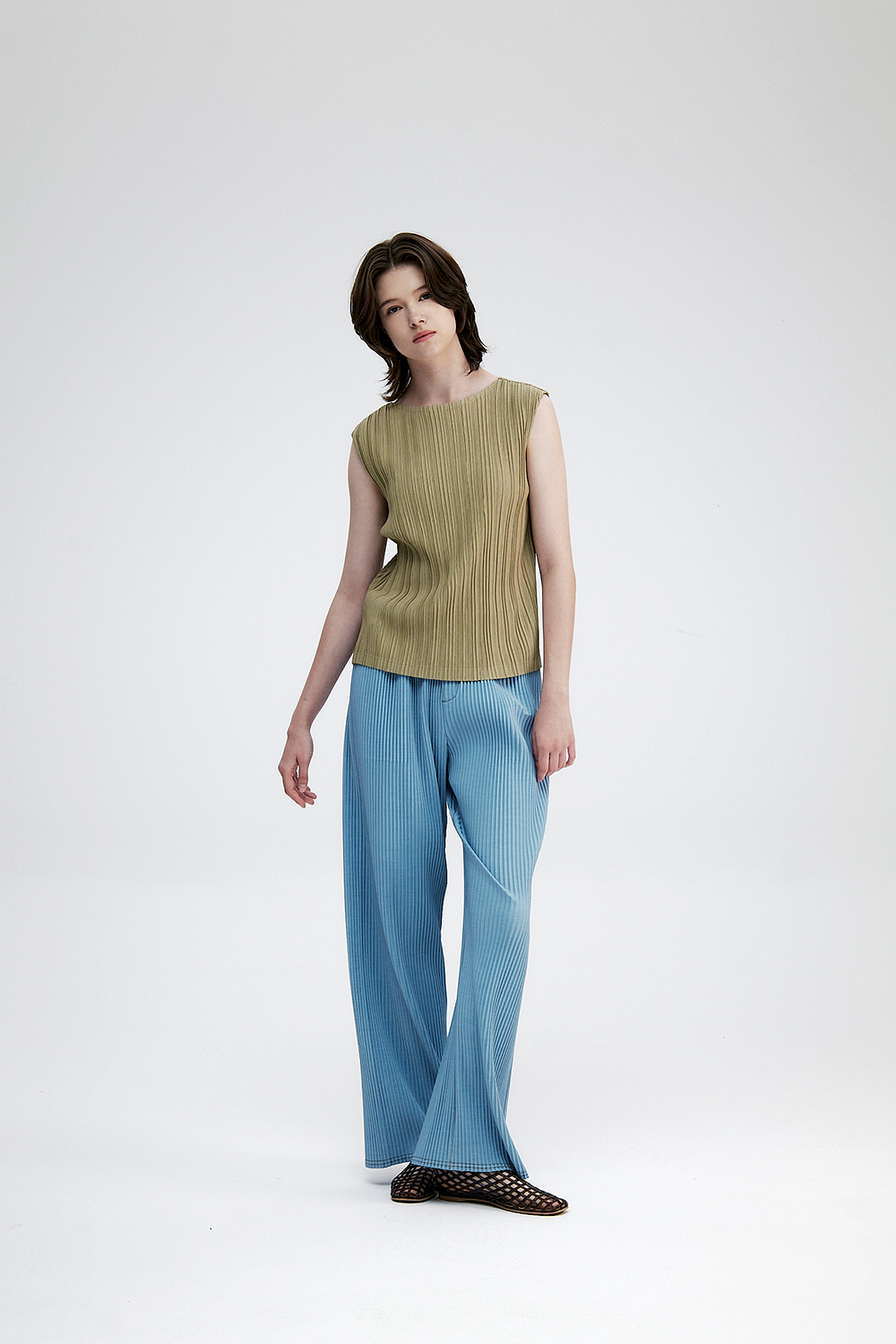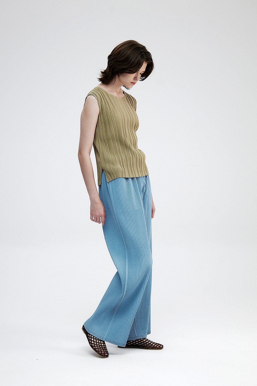몽플리쎄 여성 투웨이 라운드넥 슬리브리스 저지 플리츠 탑 베이지