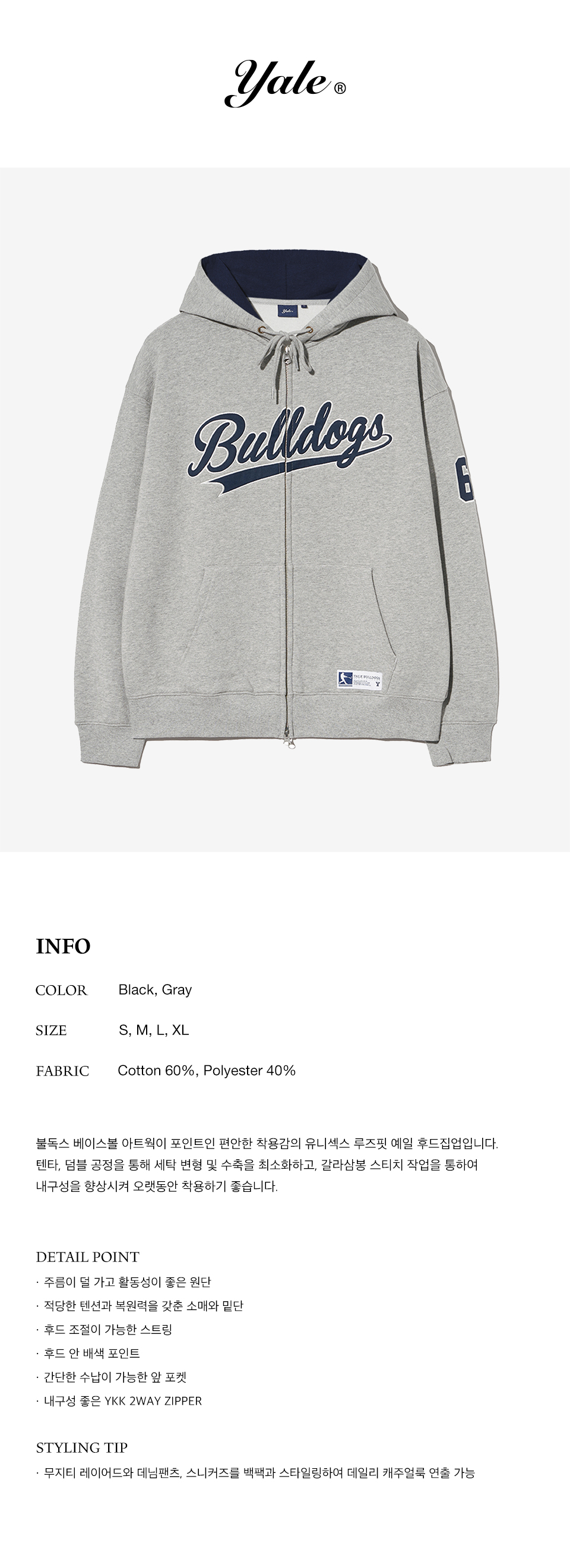 예일 64 불독스 베이스볼 후드 집업_그레이