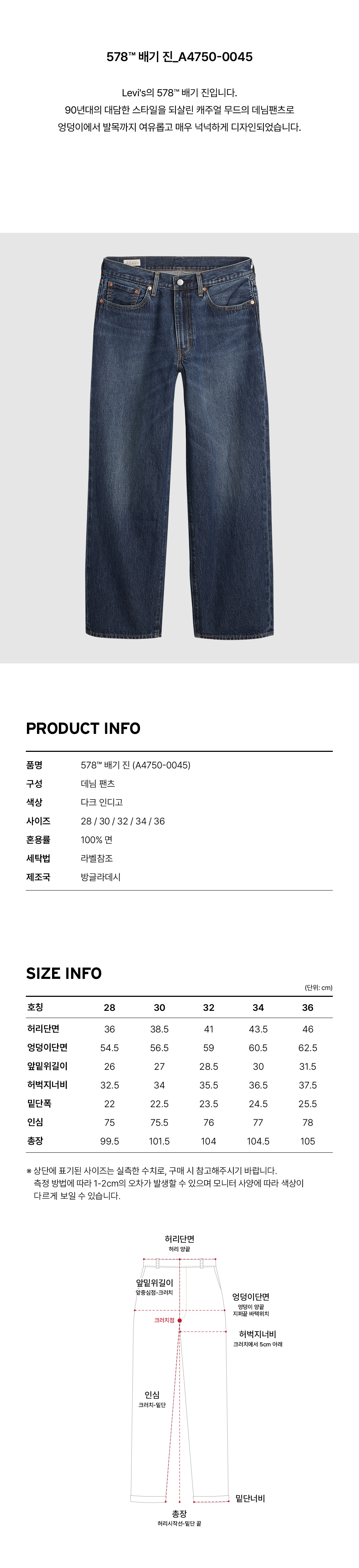 Levi's의 578™ 배기 진입니다. 90년대의 대담한 스타일을 되살린 캐주얼 무드의 데님팬츠로 엉덩이에서 발목까지 여유롭고 매우 넉넉하게 디자인되었습니다.