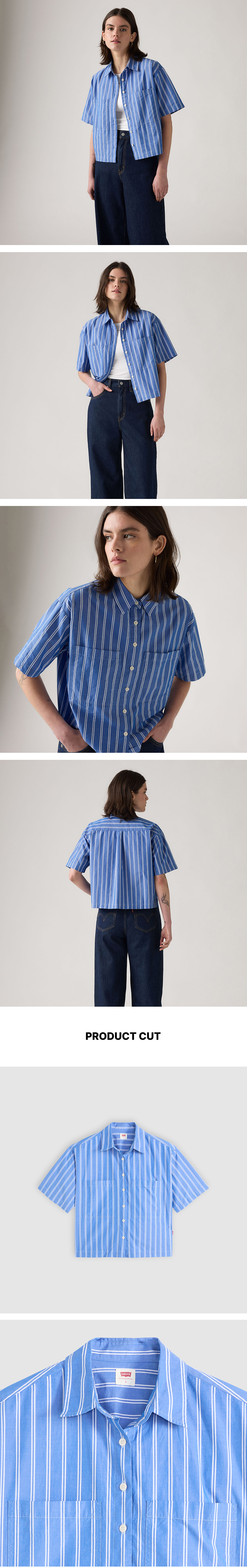 Levi's의 할리 숏슬리브 크롭 셔츠입니다. 크롭된 릴렉스핏으로 편안하게 착용할 수 있으며 클래식한 버튼업 디자인과 두 개의 체스트 패치 포켓이 포인트입니다. 간편하게 걸치기 좋은 크롭 셔츠로 데일리룩에 스타일리시함을 더해줍니다.