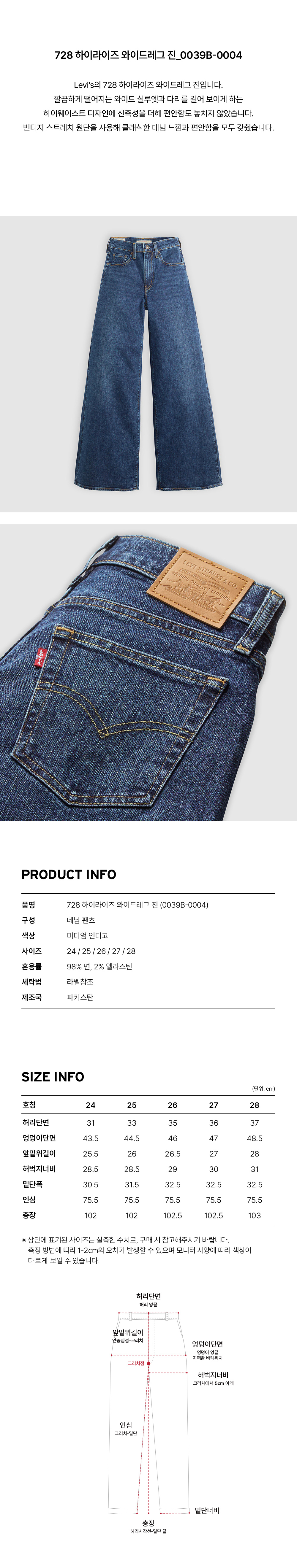 Levi's의 728 하이라이즈 와이드레그 진입니다. 깔끔하게 떨어지는 와이드 실루엣과 다리를 길어 보이게 하는 하이웨이스트 디자인에 신축성을 더해 편안함도 놓치지 않았습니다. 빈티지 스트레치 원단을 사용해 클래식한 데님 느낌과 편안함을 모두 갖췄습니다.