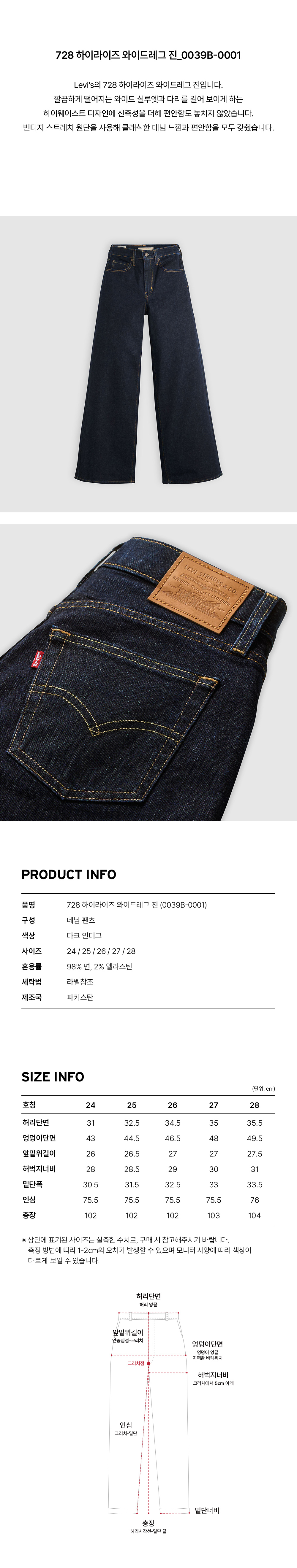 Levi's의 728 하이라이즈 와이드레그 진입니다. 깔끔하게 떨어지는 와이드 실루엣과 다리를 길어 보이게 하는 하이웨이스트 디자인에 신축성을 더해 편안함도 놓치지 않았습니다. 빈티지 스트레치 원단을 사용해 클래식한 데님 느낌과 편안함을 모두 갖췄습니다.