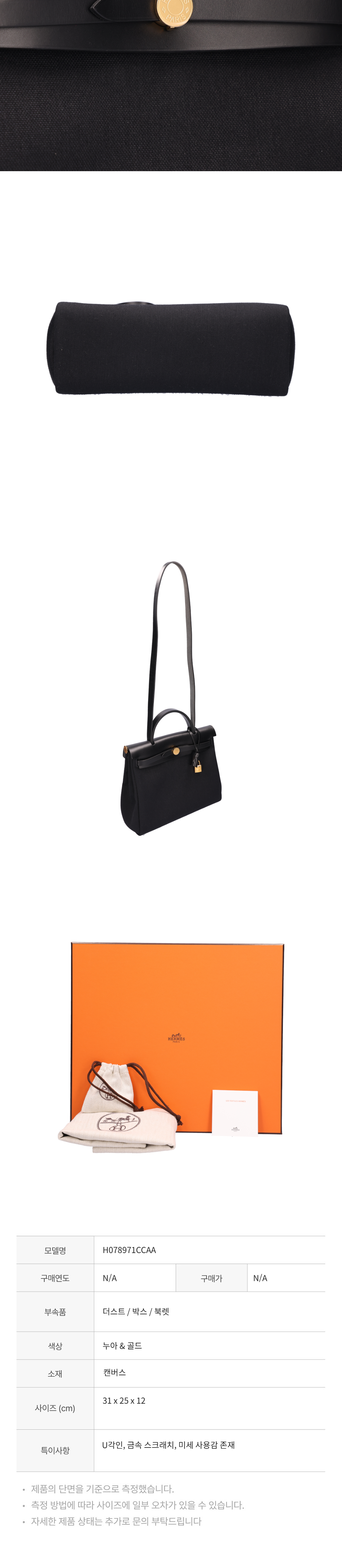 [A등급] 에르메스 H078971CCAA 에르백 집 31 백 캔버스 누아 금장 U각인