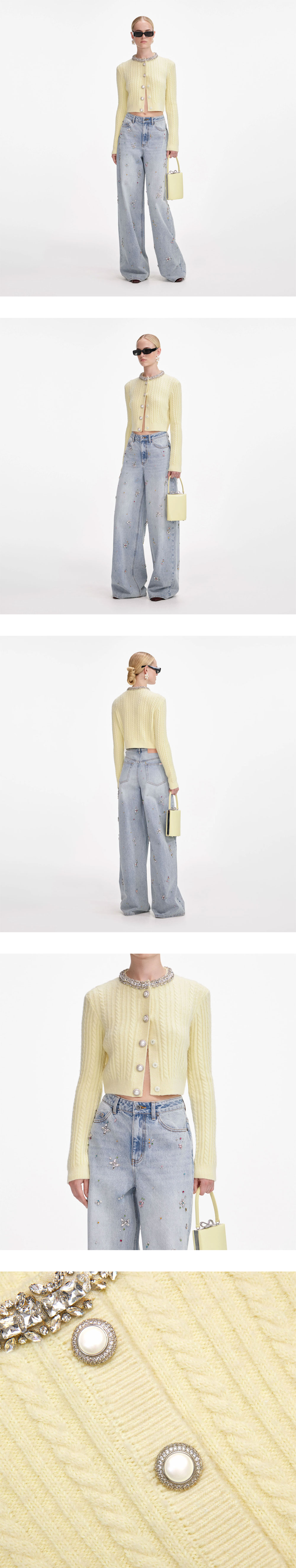 넥라인 큐빅이 포인트인 셀프 포트레이트 우먼 알파카 가디건 옐로우입니다. - 정사이즈 핏 - 신축성 있는 니트 소재 - 슬림 핏 크롭 니트 자켓 - 브레이드 니트 디테일 - 긴 소매 디자인 - 프론트 버튼 클로저 - 장식용 버튼 디테일 *모델 신장 178cm, S 사이즈 착용