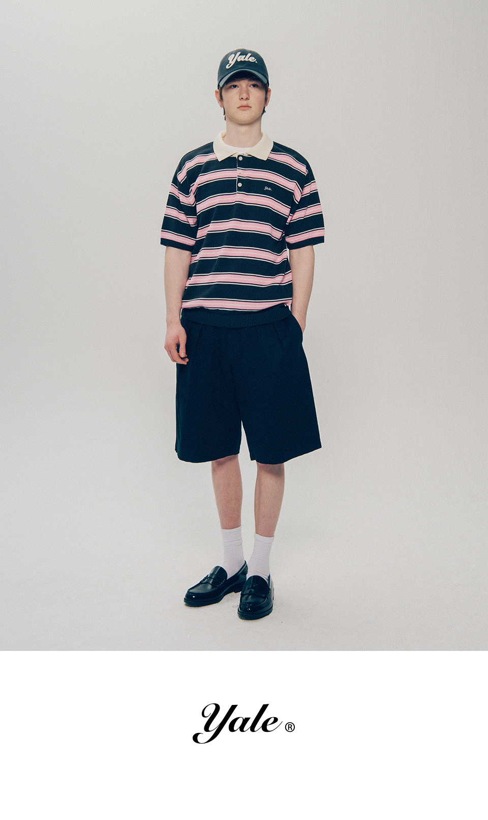 예일 멀티 스트라이프 카라 니트 반팔_차콜