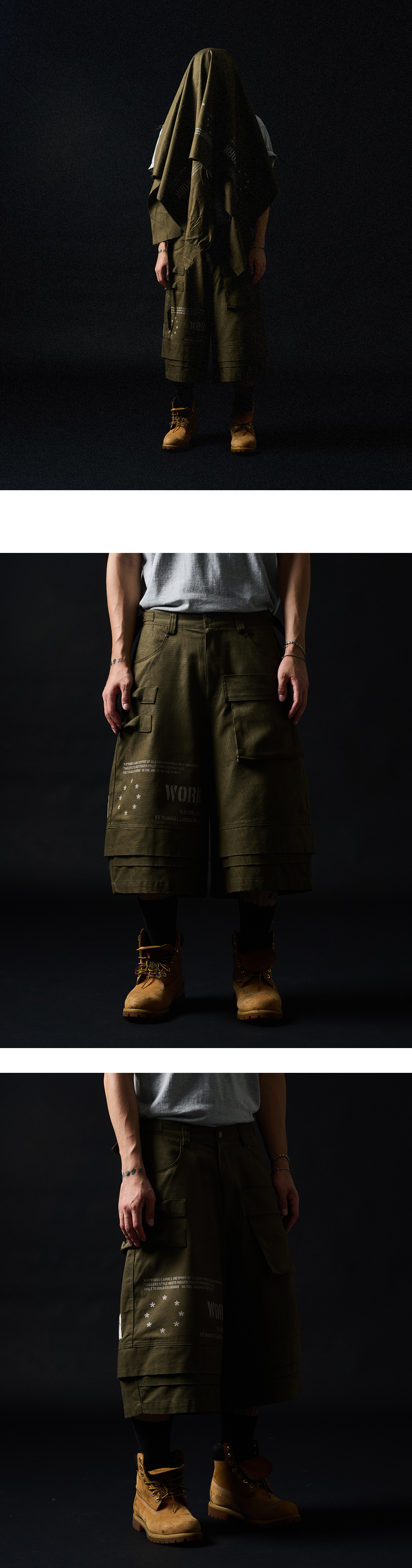 - 와이드핏 버뮤다팬츠 - 견고하며 부드러운 코튼100% 옥스포드원단 * SS - 3D 전면 포켓과 뒷판 YKK지퍼(소가죽팁) 입체 주머니 - 2개의 망치걸이 디테일 - 허리 사이드 비조 , 벨트고리 D링 - 전면 밑단 3겹 후면 2겹 레이어드 (컷팅 후 세탁시 빈티지한 올풀림연출)