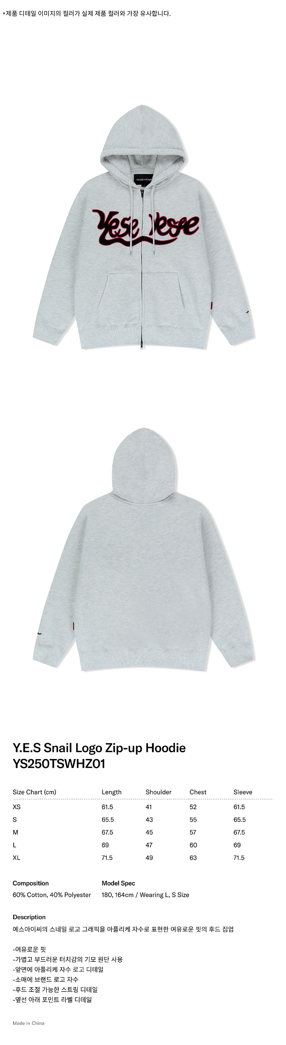 예스아이씨 예스 스네일 로고 집업 후디 라이트 그레이