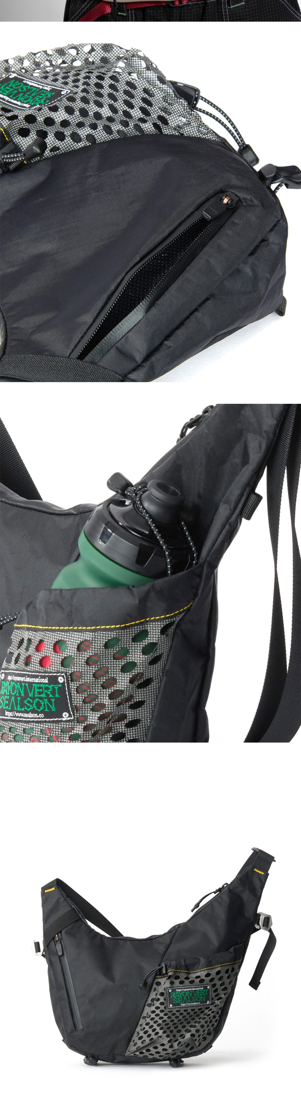 레이온 버트 x 씰슨 엑스바디 백 블랙입니다. - RAYON VERT × SEALSON 협업 크로스바디 백 - 방수성과 내구성이 뛰어난 Ecopak™ 바디 원단 - ULTRA™ 포켓 원단 - 전면 레이저 컷 메쉬 포켓 디자인 - 워터보틀 수납이 가능한 외부 포켓 - 숄더 루프 디테일로 활동 시 흔들림 최소화