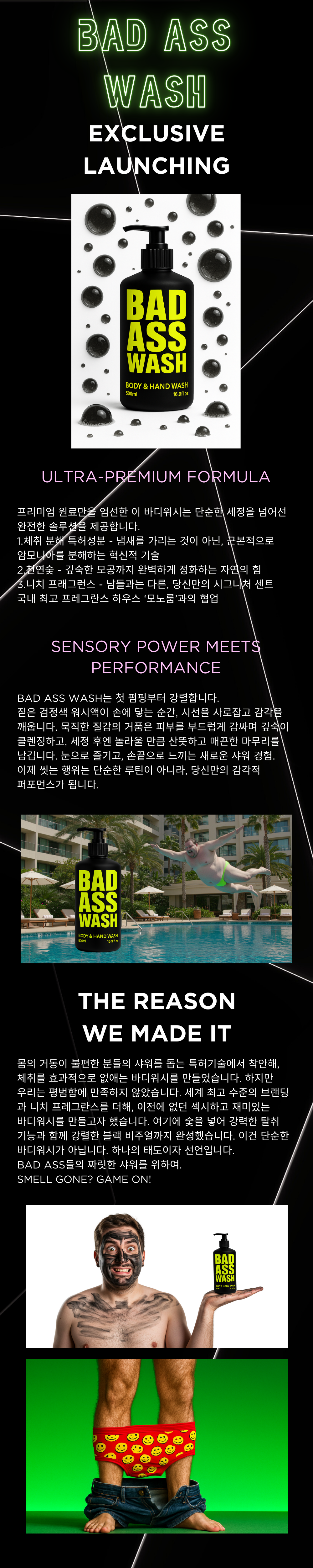BAD ASS WASH – Body & Hand Wash "Smell gone. Game on." 강렬한 블랙 바틀과 네온 타이포가 시선을 사로잡는 BAD ASS WASH는 몸과 손을 한 번에 케어하는 올인원 워시입니다. 강력한 세정력으로 땀, 먼지, 냄새를 말끔히 제거하고, 니치 향 블렌딩으로 하루 종일 지속되는 상쾌함을 선사합니다. 매트 블랙 디자인은 욕실에서도 스타일을 놓치지 않는 당신을 위해 완성되었습니다. 500ml 대용량으로 매일 자신감을 씻어내고 새로 입으세요. MADE FOR BADASS ONLY.