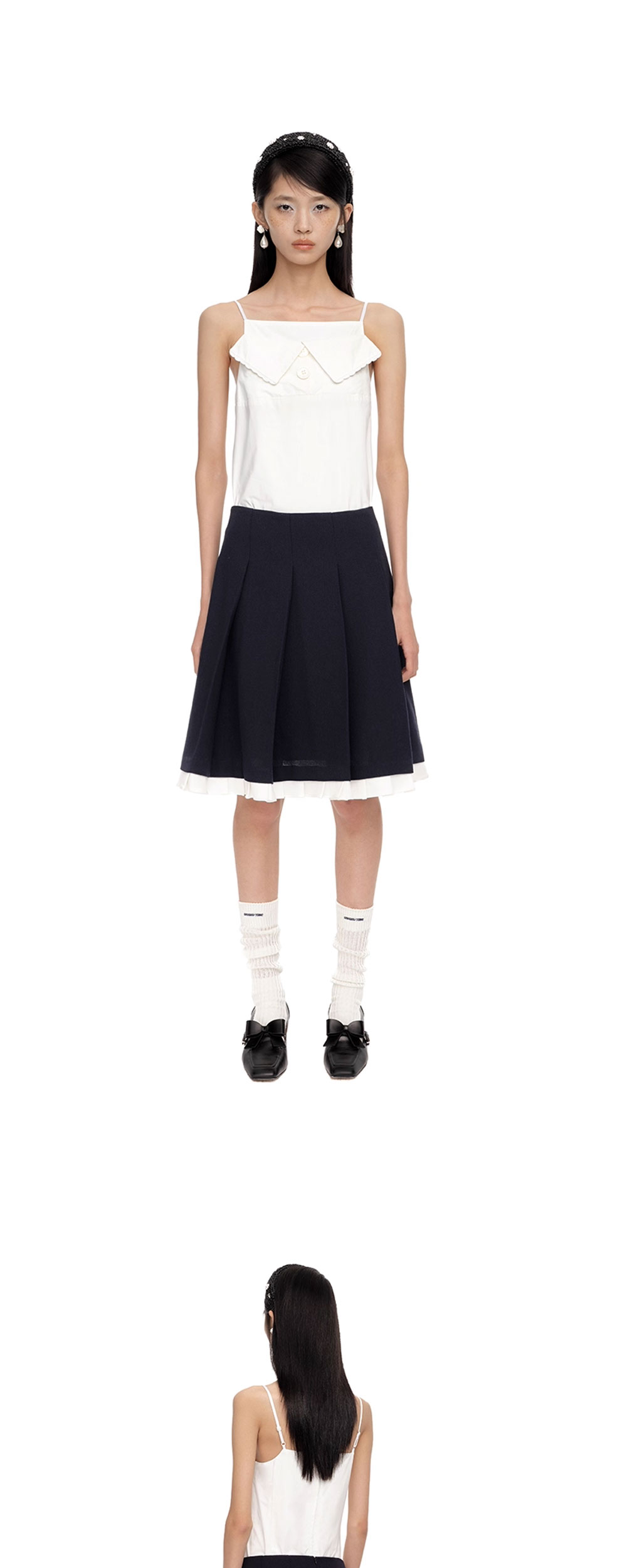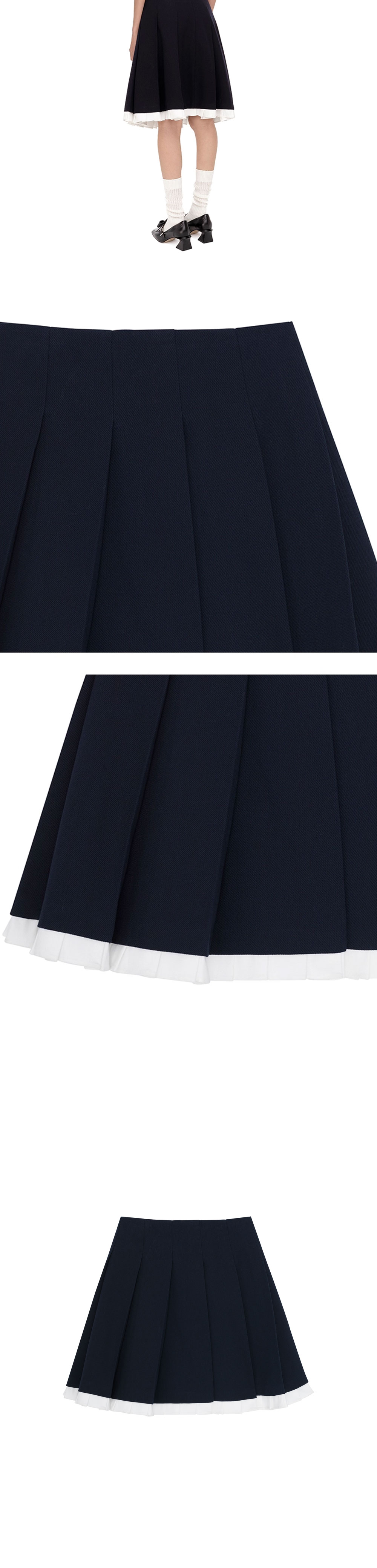 밑단이 포인트인 슈슈통 우먼 패치워크 레이스 와이드 플리츠 스커트 네이비 블루입니다. - 하단으로 자연스럽게 떨어지는 플리츠 스커트는 활동성을 높임 - 밑단에 트리밍된 화이트 레이스 디테일이 룩에 로맨틱한 포인트를 더함