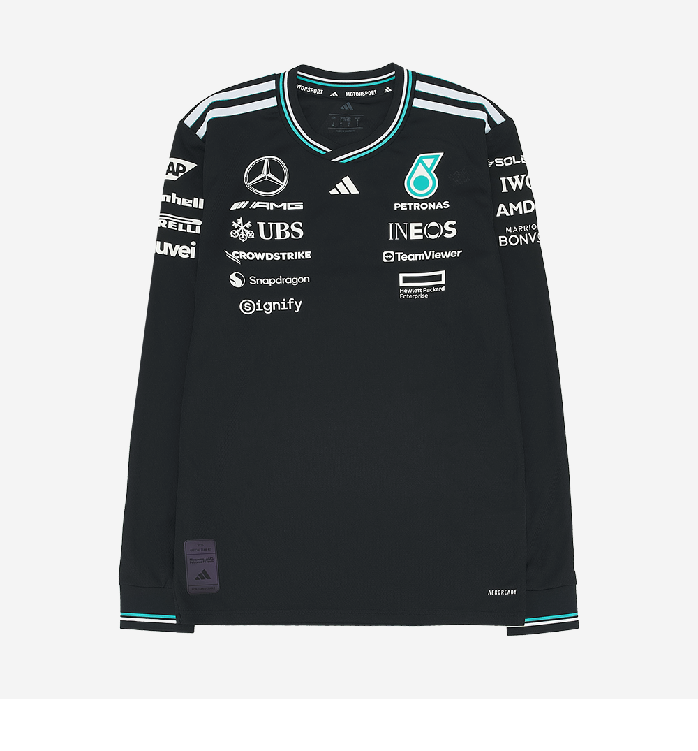 메르세데스 AMG 페트로나스 x 아디다스 포뮬러 원 2025 팀 드라이버 저지 어센틱 롱 슬리브 블랙 화이트 - US 사이즈