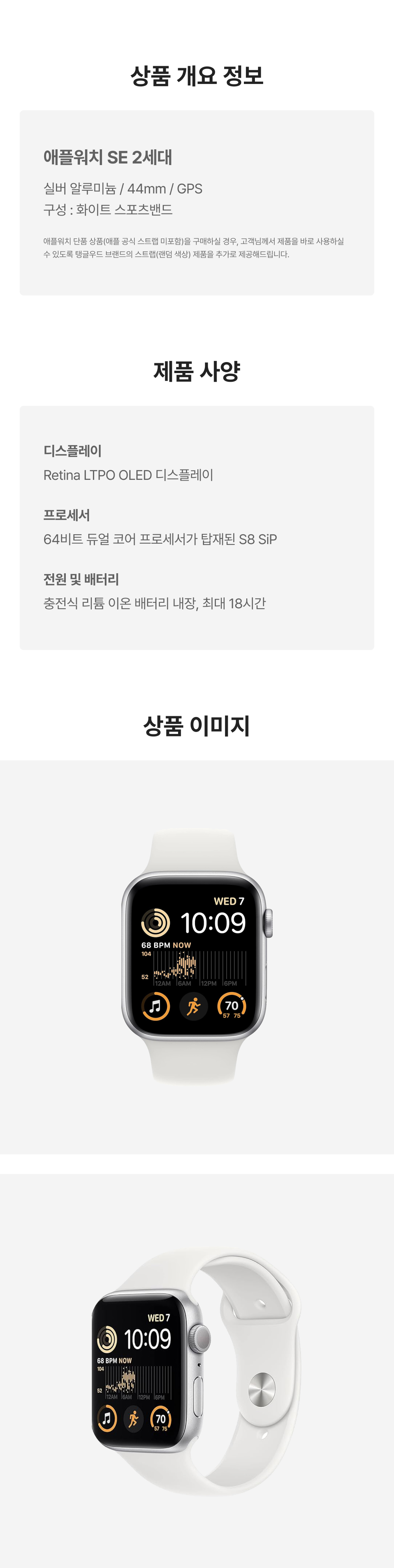 [S등급] 리퍼비시 애플워치 SE 2세대 44mm GPS 실버 알루미늄 케이스 스포츠 밴드 화이트