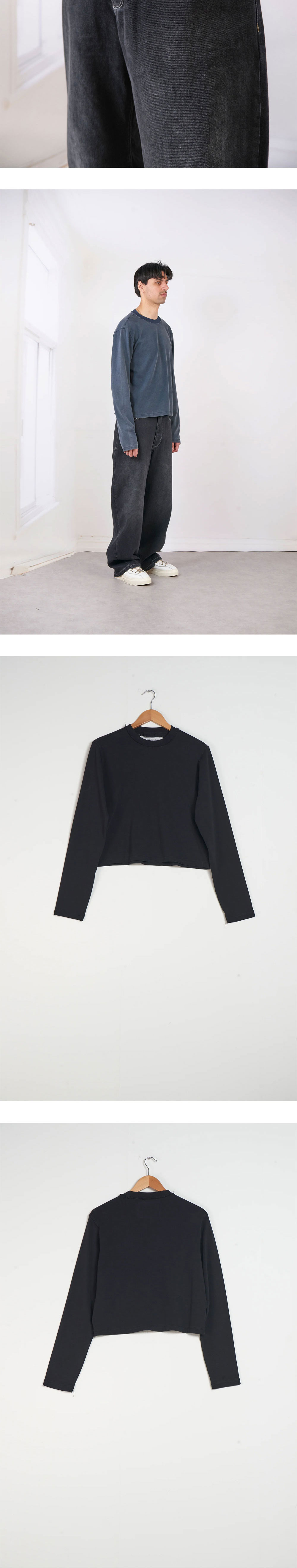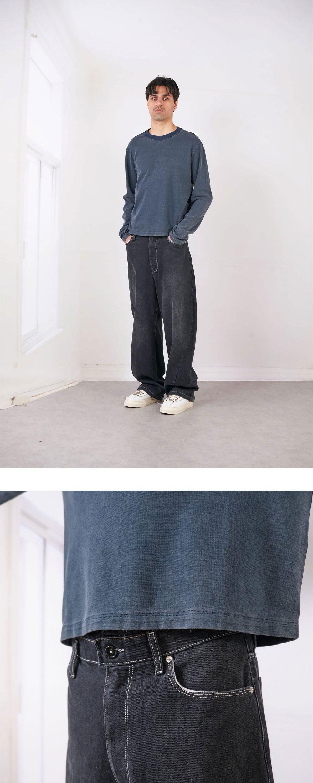 빈티지 워싱된 느낌의 카미엘 포트젠스 노멀 티 롱 슬리브 네이비입니다. - 노멀 핏 롱슬리브 티셔츠 - 리브 져지 소재 - 크루 넥 디자인 - 배색의 불규칙한 탑스티치 디테일 - 넥 라인에 러프한 컷오프 마감 디테일