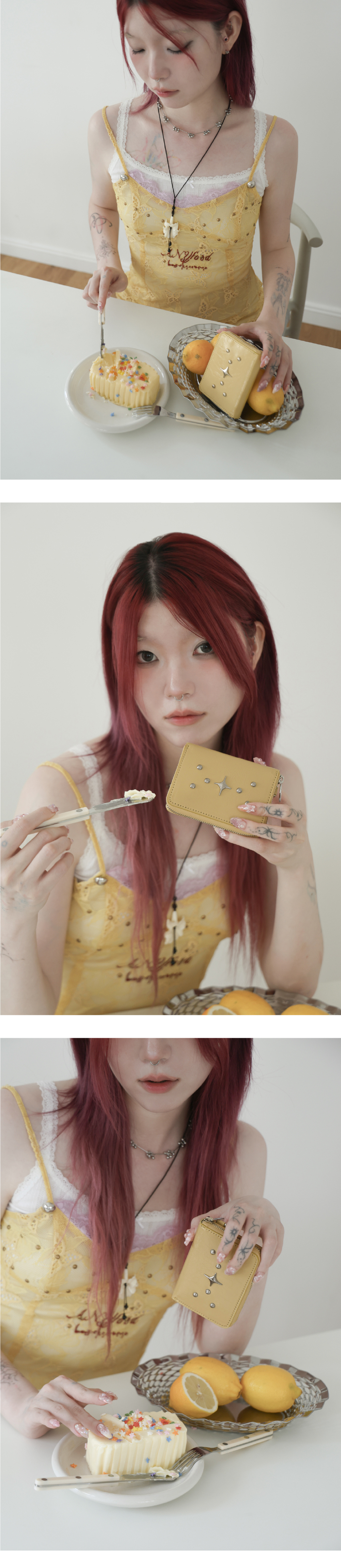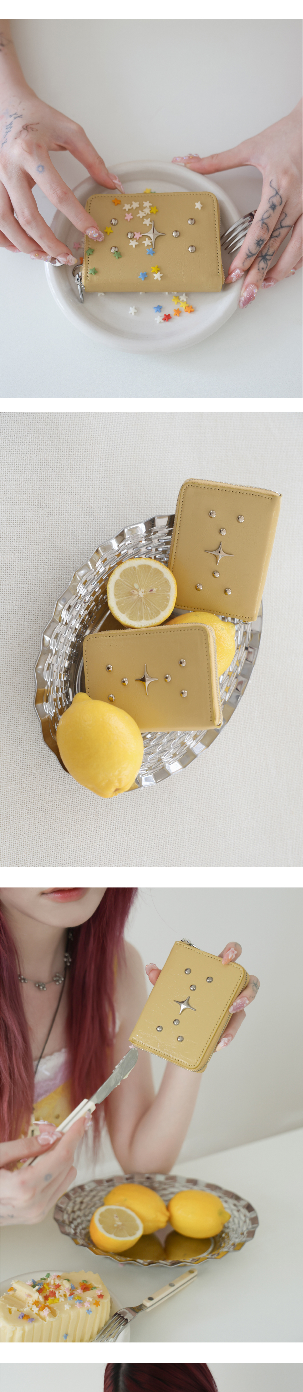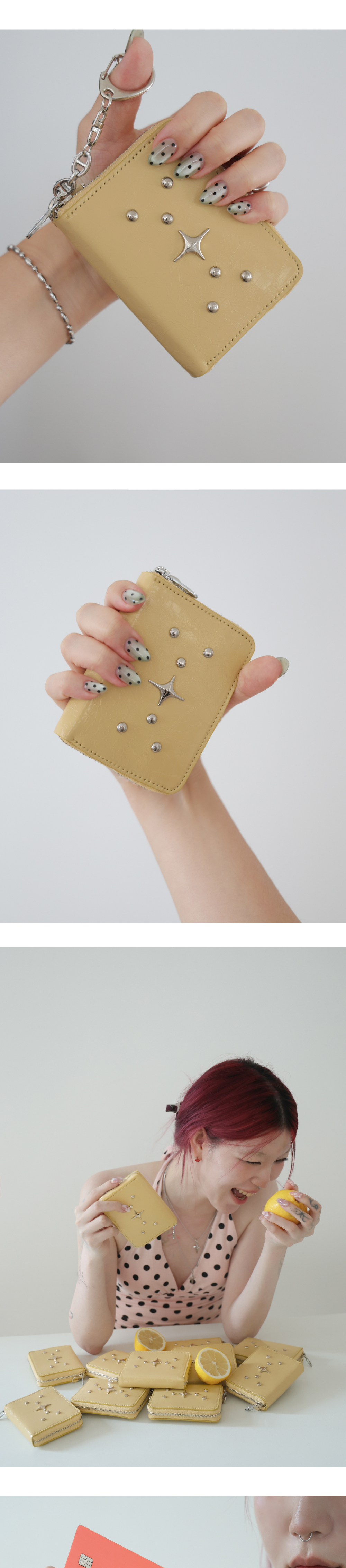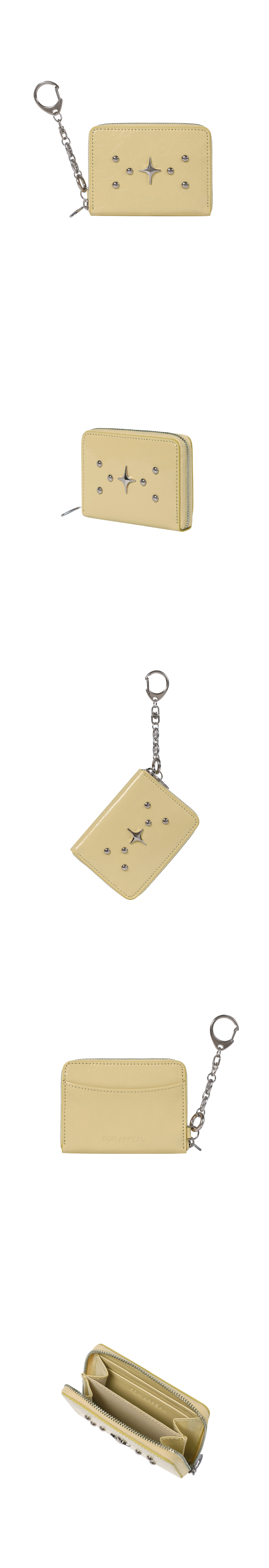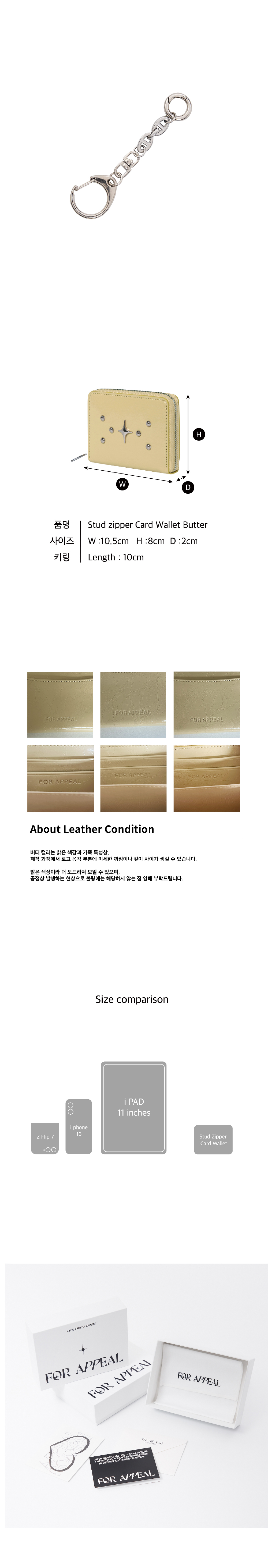 포어필의 ’Sparkle star’라인의 지퍼 카드지갑 입니다. Sparkle star 팬던트와 스터드 디테일이 조화를 이루는 카드 지갑입니다. 내부 카드포켓4개 ,중앙 수납칸 2개, 뒤 카드포켓 1개의 실용적인 구성으로, 최대 15개의 카드수납이 가능합니다. 탈부착이 가능한 써지컬 스틸 키링이 제공됩니다. 박스 패키징 구성으로 선물하기에 용이합니다. 버터 컬러는 섬세한 질감과 우수한 내구성을 지닌 카프스킨(송아지 가죽)에 특수 호일과 염료를 더해, 자연스러운 광택과 불규칙한 크랙 질감을 구현한 가죽을 사용하였습니다. 고급스러운 광도와 주름이 특징입니다.