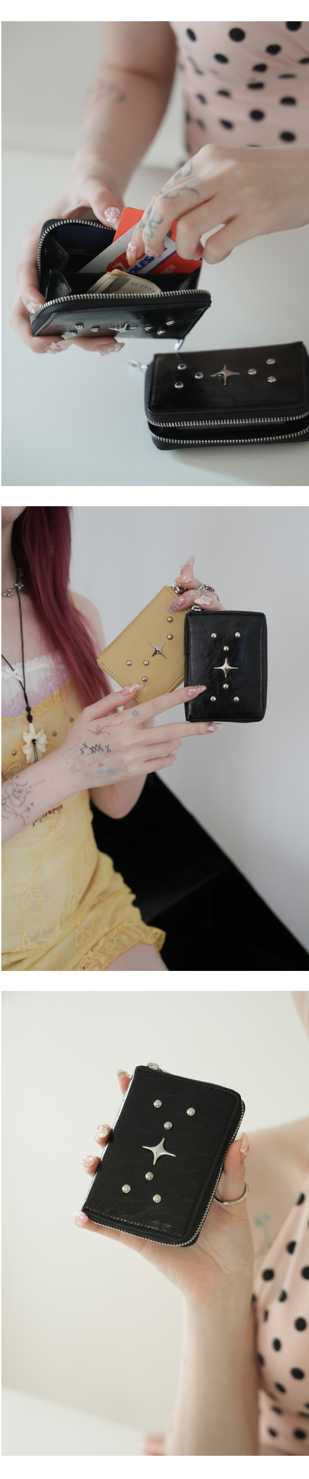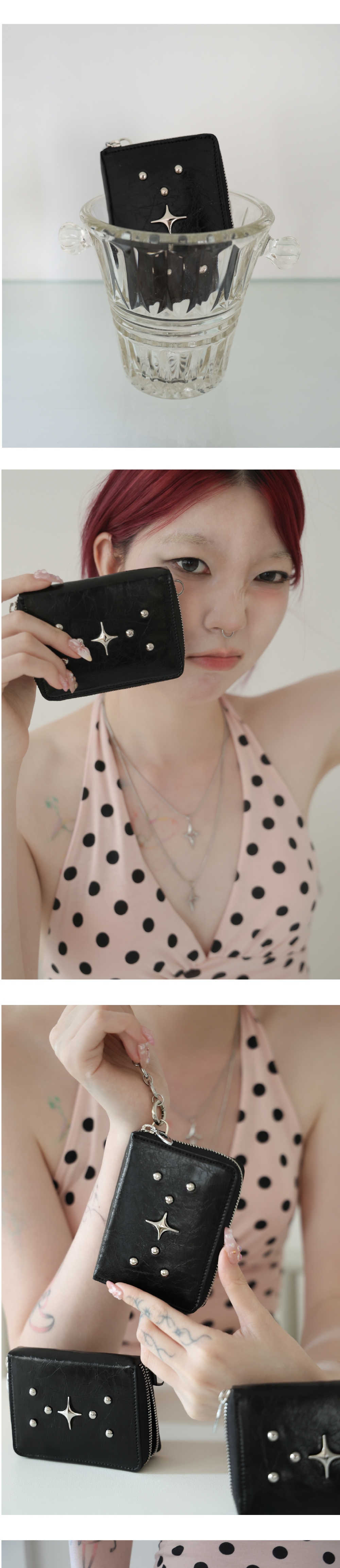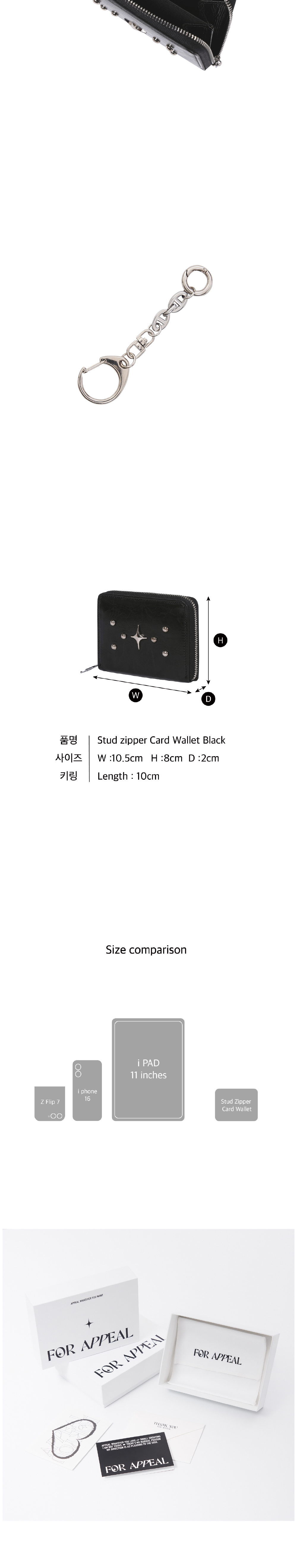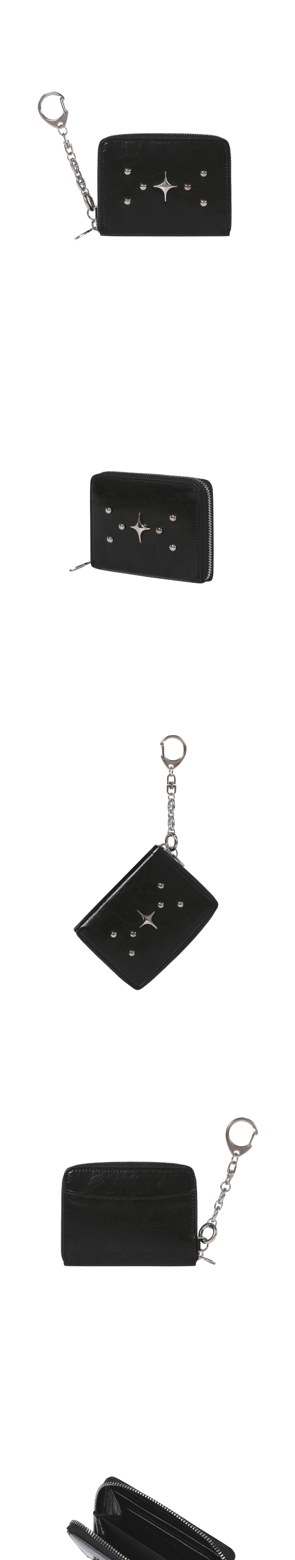 포어필의 ’Sparkle star’라인의 지퍼 카드지갑 입니다. Sparkle star 팬던트와 스터드 디테일이 조화를 이루는 카드 지갑입니다. 내부 카드포켓4개 ,중앙 수납칸 2개, 뒤 카드포켓 1개의 실용적인 구성으로, 최대 15개의 카드수납이 가능합니다. 탈부착이 가능한 써지컬 스틸 키링이 제공됩니다. 박스 패키징 구성으로 선물하기에 용이합니다. 블랙 컬러는 크랙감이 있는 베지터블 소가죽으로 자연스러운 광도와 불규칙한 주름으로 한층 고급스러운 질감을 표현하였습니다.