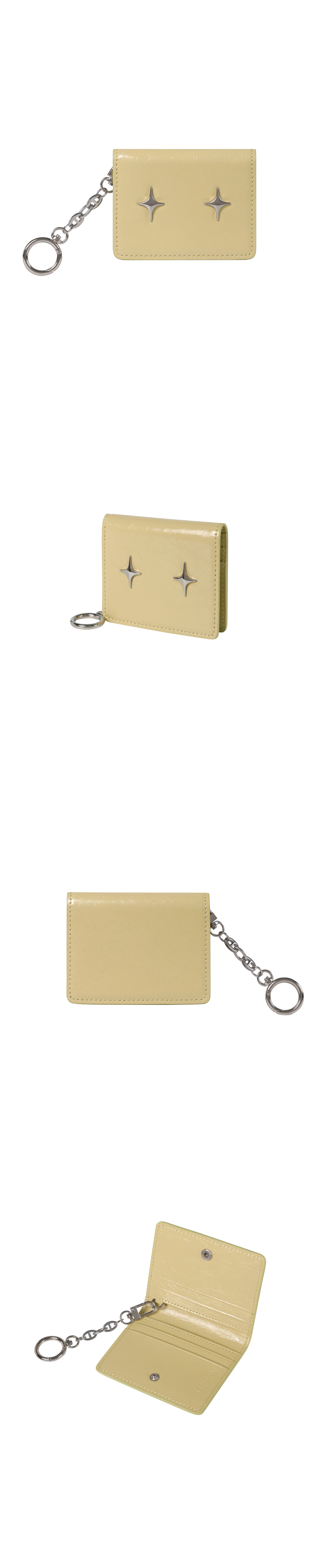 'Sparkle star' 팬던트 장식이 특징인 카드지갑 카드포켓 6개 탈부착이 가능한 키링 제공 한 손에 잡히는 컴팩트한 사이즈 박스패키징 구성으로 선물하기에 용이합니다. 버터 컬러는 섬세한 질감과 우수한 내구성을 지닌 카프스킨(송아지 가죽)에 특수 호일과 염료를 더해, 자연스러운 광태과 불규칙한 크랙 질감을 구현한 가죽을 사용하였습니다. 고급스러운 광도와 주름이 특징입니다.