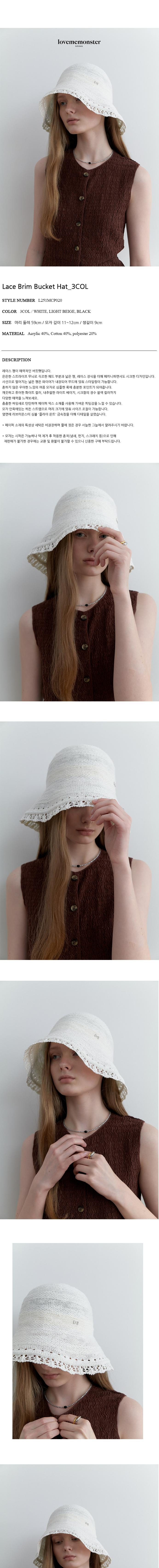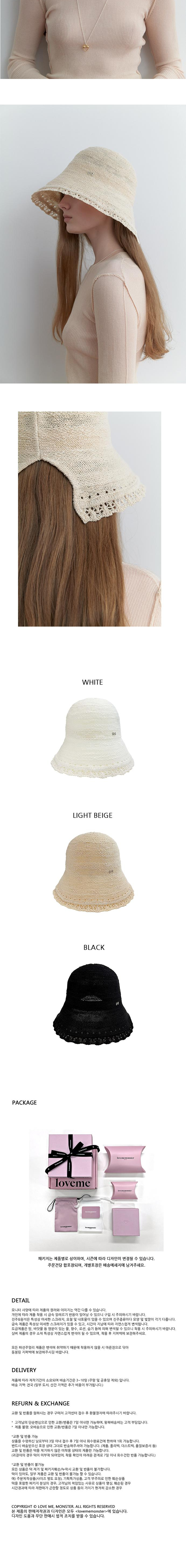 '레이스 챙이 매력적인 버킷햇입니다. 은은한 스트라이프 무늬로 직조한 헤드 부분과 넓은 챙, 레이스 장식을 더해 페미니하면서도 시크한 디자인입니다. 사선으로 떨어지는 넓은 챙은 와이어가 내장되어 무드에 맞춰 스타일링이 가능합니다. 흔하지 않은 우아한 느낌의 여름 모자로 심플한 룩에 충분한 포인트가 되어줍니다. 깨끗하고 퓨어한 화이트 컬러, 내추럴한 라이트 베이지, 시크함의 정수 블랙 컬러까지 다양한 매력을 느껴보세요. 촘촘한 짜임새로 탄탄하며 페이퍼 믹스 소재를 사용해 가벼운 피팅감을 느낄 수 있습니다. 모자 안쪽에있는 히든 스트랩으로 머리 크기에 맞춰 사이즈 조절이 가능합니다. 옆면에 러브미몬스터 심볼 '플라이 몬트' 금속참을 더해 디테일을 살렸습니다.