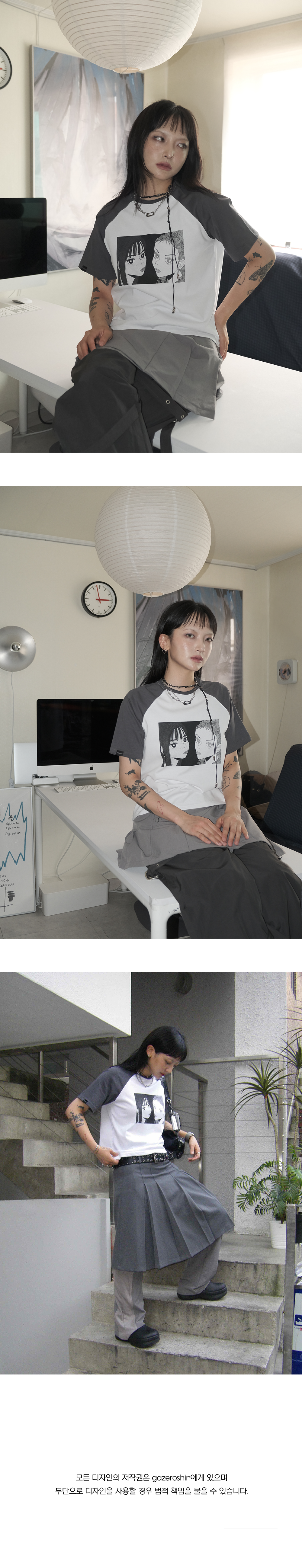 가제로신(gazeroshin)의 ‘소녀들’ 메인 일러스트를 담아 완성한 배색 나그랑 티셔츠입니다. 부드럽고 은은한 차콜과 화이트 믹스로, 화이트 몸판에 일러스트의 나염이 선명하게 스며들어 부담 없이 다양한 룩에 매치할 수 있습니다. 축률 테스트를 거친 면+폴리 혼방 소재로 제작해 시원하고 편안한 착용감을 제공합니다. OS(One Size) 구성으로, 체형에 따라 각기 다른 실루엣이 연출되며 입는 사람만의 매력을 살려줍니다. 소매에는 작은 포인트 라벨, 뒷판 하단에는 붉은색 택션지 디테일을 더해 뒷모습까지 특별함을 담았습니다. 하나만 입어도 존재감이 충분하고, 다양한 스타일링에 자연스럽게 녹아드는 티셔츠입니다.