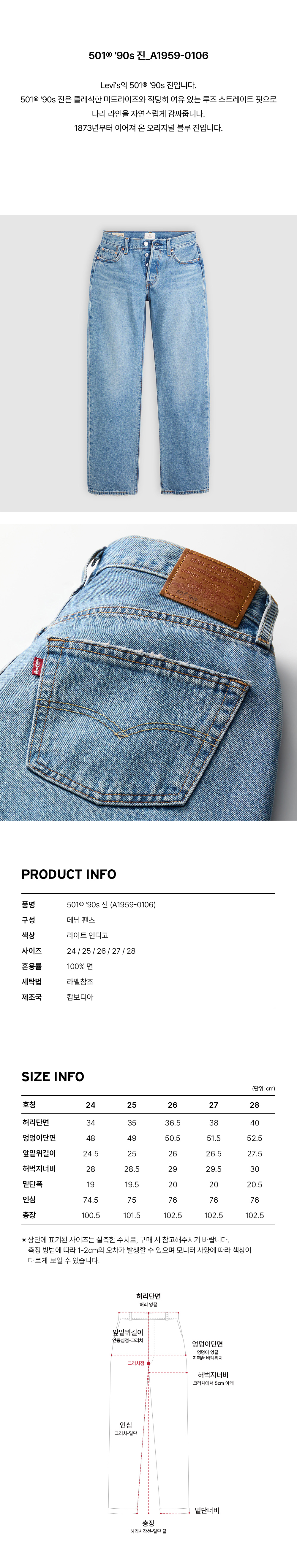Levi's의 501® '90s 진입니다. 501® '90s 진은 클래식한 미드라이즈와 적당히 여유 있는 루즈 스트레이트 핏으로 다리 라인을 자연스럽게 감싸줍니다. 1873년부터 이어져 온 오리지널 블루 진입니다.