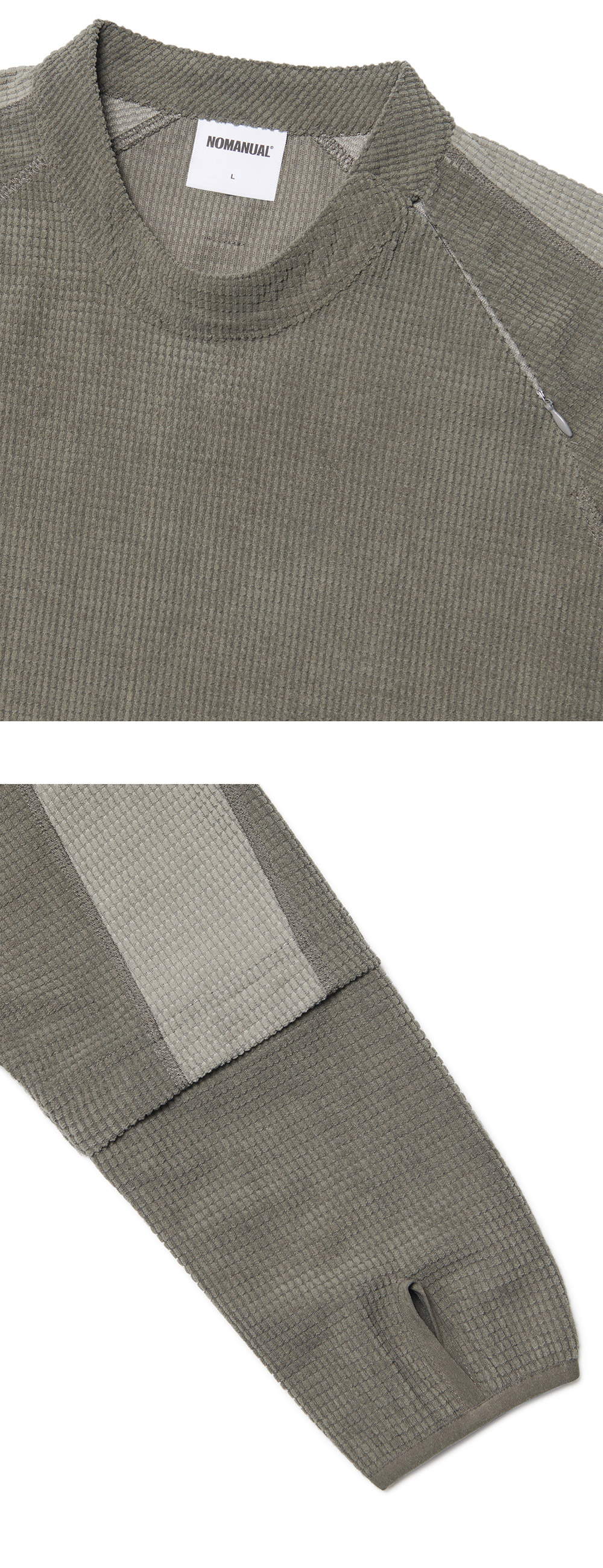 MODEL MAN : 180CM (L SIZE) POLYESTER 100% ZIPPER (YKK社) THUMB HOLE DETAIL * 두꺼운 폴리백 특성상 옷에 슬립제가 묻어나올 수 있습니다. 어두운 색 계열의 상품 구매시 보이는 슬립제는 불량의 사유가 아님을 알려드립니다.