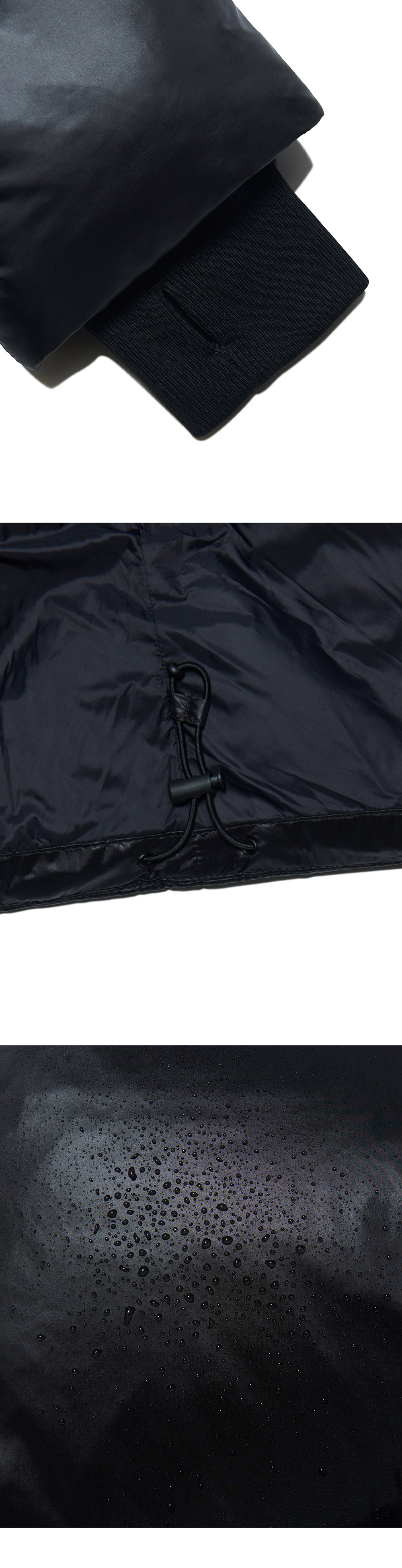 MODEL MAN : 180CM (L SIZE) WOMAN : 165CM (XS (WOMAN) SIZE) OUTSHELL : NYLON 100% LINING : NYLON 100% FILLING : RDS DUCK DOWN 80% RDS DUCK FEATHER 20% S M L XL SIZE > FILLING AMOUNT 380G XS (WOMAN) SIZE > FILLING AMOUNT 240G 2WAY ZIPPER THUMB HOLE DETAIL WAIST STRING WATERPROOFING FOR DAILY USE * 제품 수령 직후에는 필파워가 약할 수 있습니다. 하루 정도 옷걸이에 걸어두시면 복원됩니다. * 두꺼운 폴리백 특성상 옷에 슬립제가 묻어나올 수 있습니다. 어두운 색 계열의 상품 구매시 보이는 슬립제는 불량의 사유가 아님을 알려드립니다.