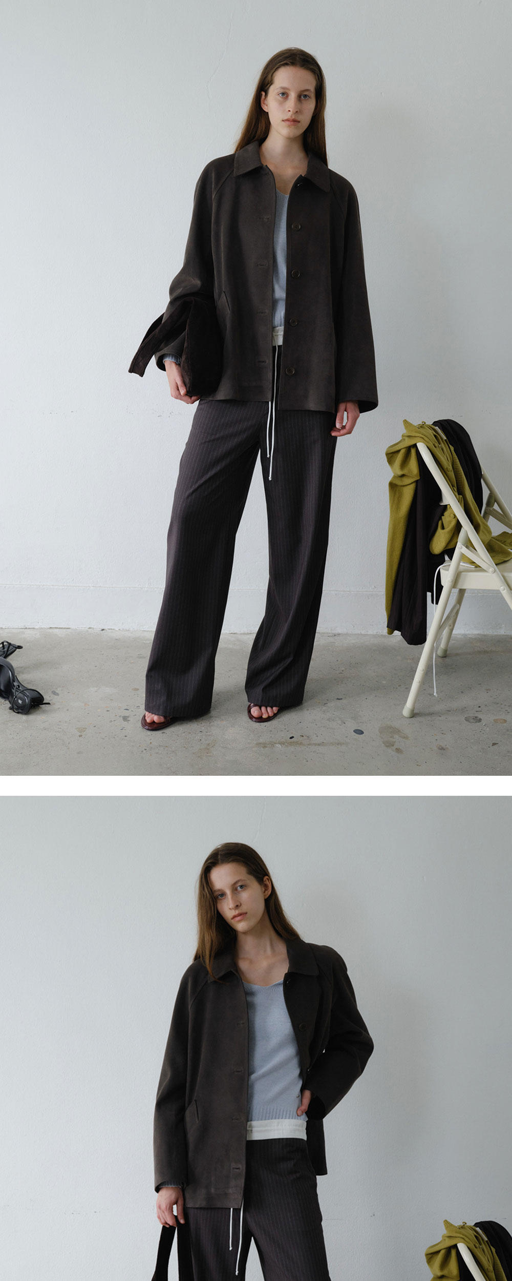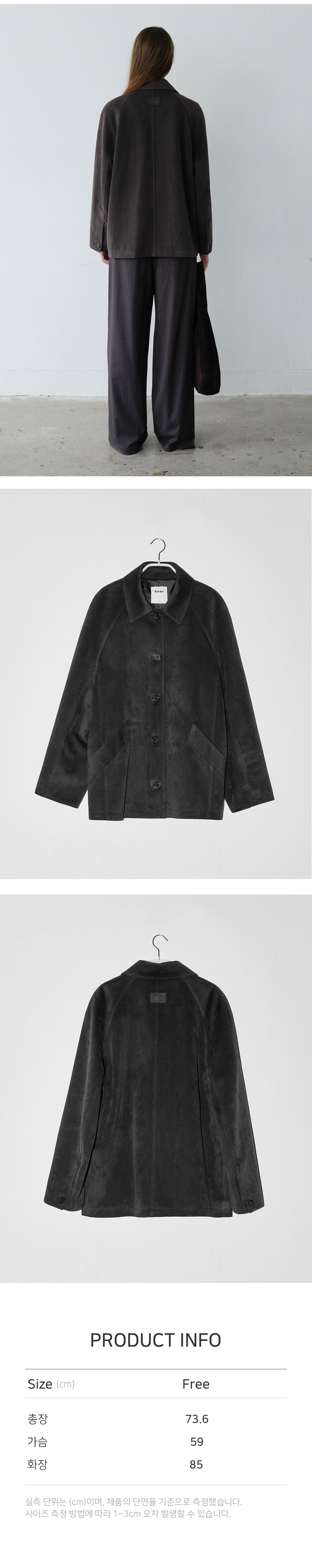- 미니멀한 디자인으로 다양한 스타일링에 자연스럽게 녹아드는 스웨이드 싱글버튼 하프 코트입니다. - 여유 있는 오버사이즈 실루엣으로 이너와의 레이어링이 자유롭고, 전체 안감 처리로 부드러운 착용감을 더했습니다. - 레글런 소매로 어깨선의 제약 없이 활동성을 높였으며, 소매 끝 슬릿과 버튼 디테일로 섬세하게 마무리했습니다 - 고급스러운 텍스처와 밀도 높은 국내 생산 고중량 스웨이드 소재를 사용해, 부드러운 터치감과 적당한 두께감으로 초겨울까지 안정적인 보온성을 제공합니다. - 허벅지 중간까지 오는 부담 없는 기장감으로 재킷처럼 가볍게 걸치기 좋으며, 포멀함과 캐주얼함을 모두 아우르는 FW 시즌 데일리 아우터로 활용도가 높습니다. - 4mm 어깨 패드가 내장되어 자연스럽고 흐트러짐 없는 실루엣을 완성해 줍니다.