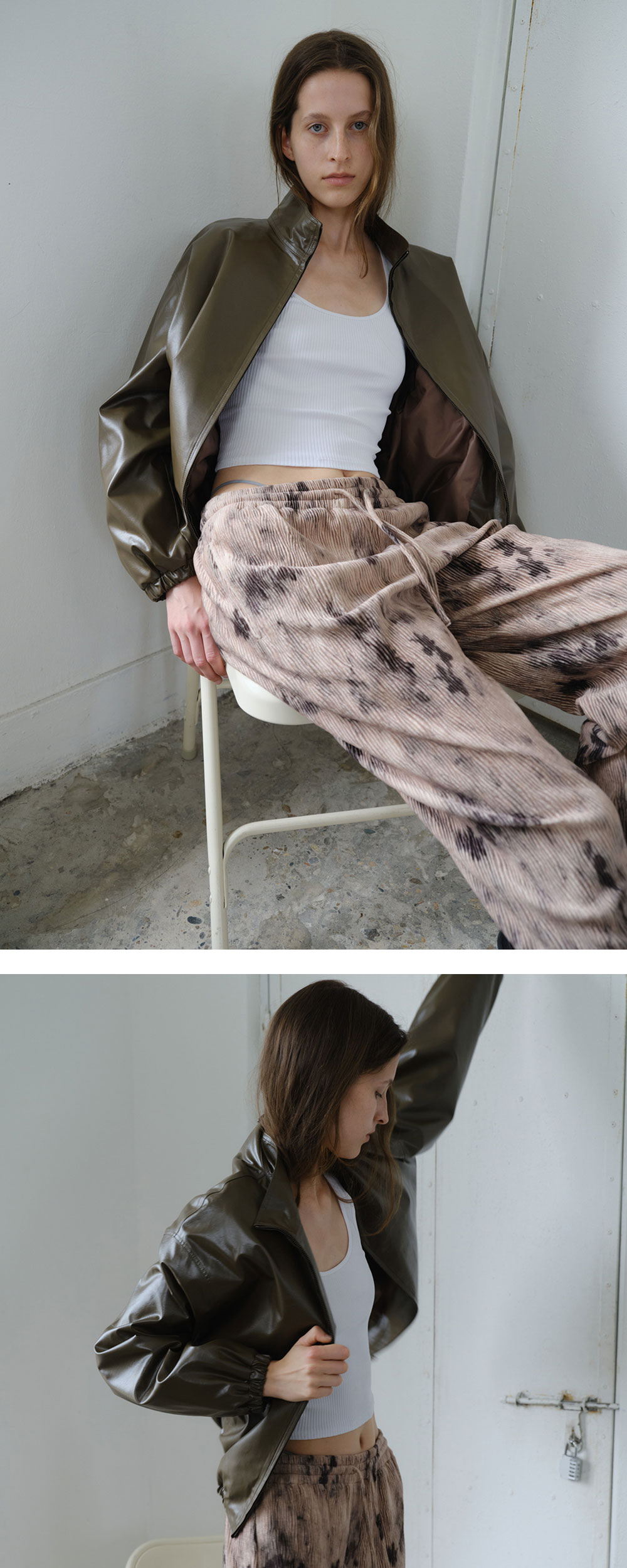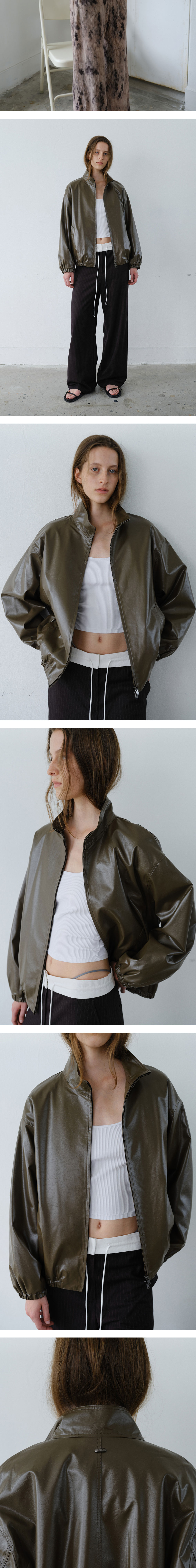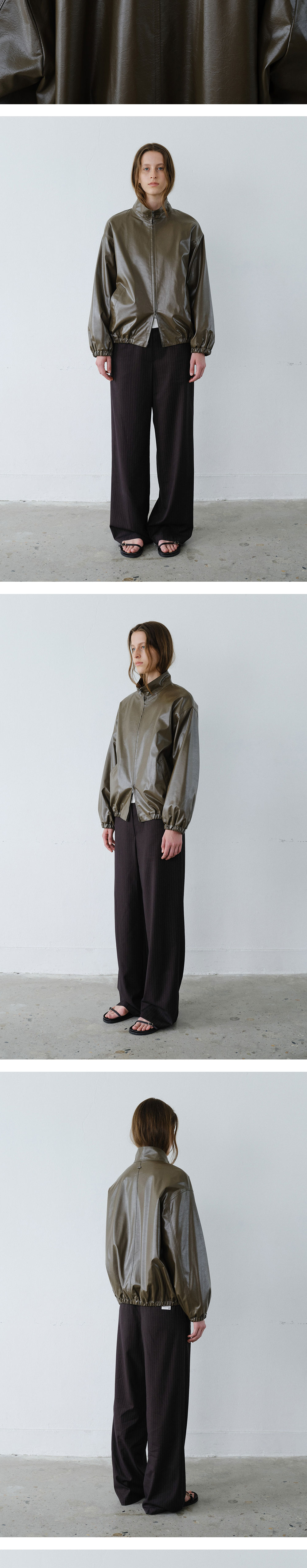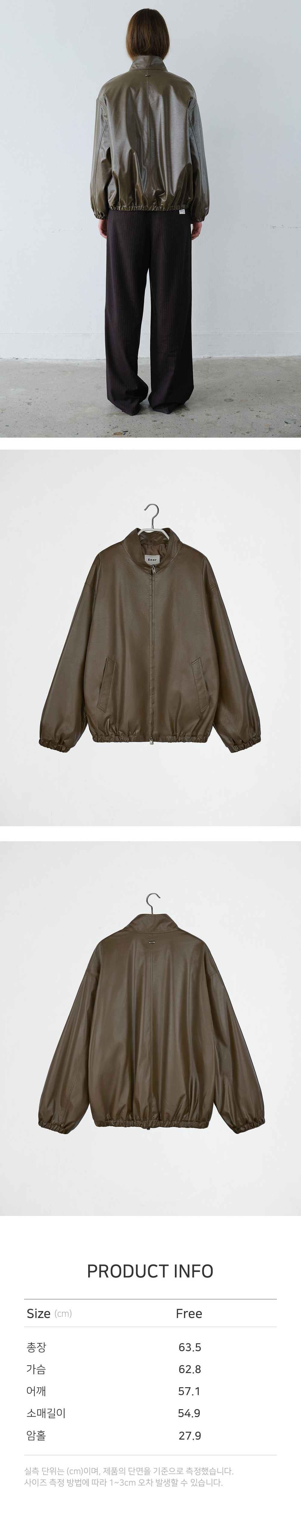 - 은은한 광택감이 매력적인 하이넥 에코 레더 블루종입니다. - 전체적으로 1온스 하스를 덧대어 적당한 두께감과 구조감 있는 실루엣을 연출해 줍니다. - 어깨 패드 없이 바디에 자연스럽게 흐르는 핏으로 편안한 착용감을 제공합니다. - 전체 안감 처리로 매끄럽고 부드러운 착용감을 더했습니다. - 소매와 밑단은 밴딩 처리되어 외부 바람을 효과적으로 막아주며, 안정적인 핏을 유지해 줍니다. - 전면에는 투웨이 지퍼를 사용해 다양한 실루엣 연출이 가능하고, 실용성도 높였습니다. - 뒷면에는 ENOR 로고가 새겨진 금속 장식을 더해 은은한 포인트와 고급스러운 마무리를 완성했습니다.