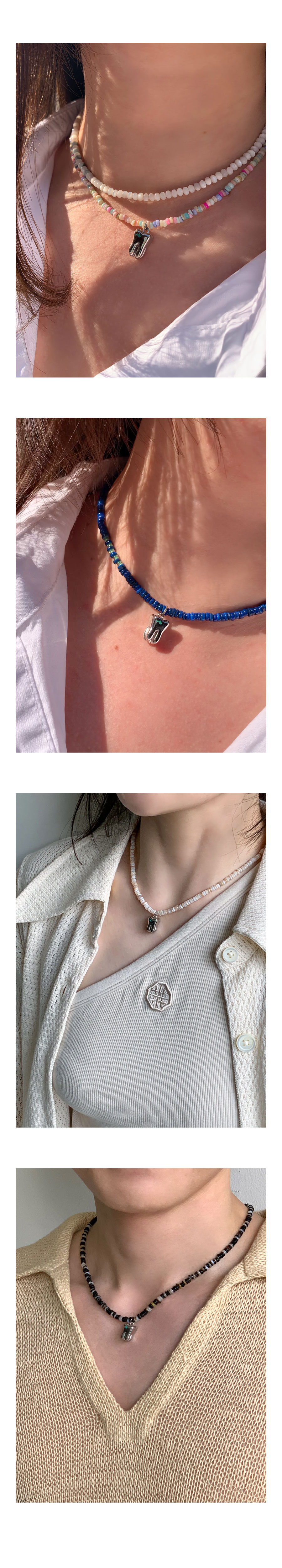 NiRO의 모든 제품은 핸드메이드로 주문 후 최대 10일 이내에 걸쳐 주문 제작됩니다. 옵션 주문 제작 시 원하는 길이를 배송 메세지에 기재해 주세요. 각각의 매력이 다른 다양한 컬러의 자개 스트랩과 니로의 어금니 참이 포인트인 목걸이입니다. 여성 추천 사이즈 42cm 남성 추천 사이즈 48cm