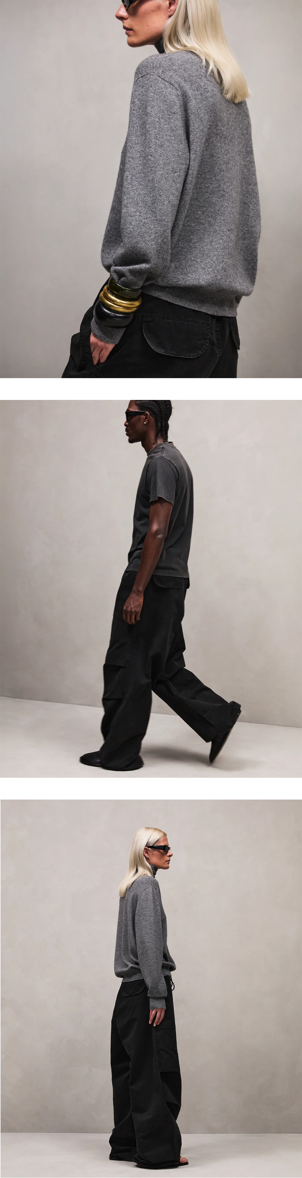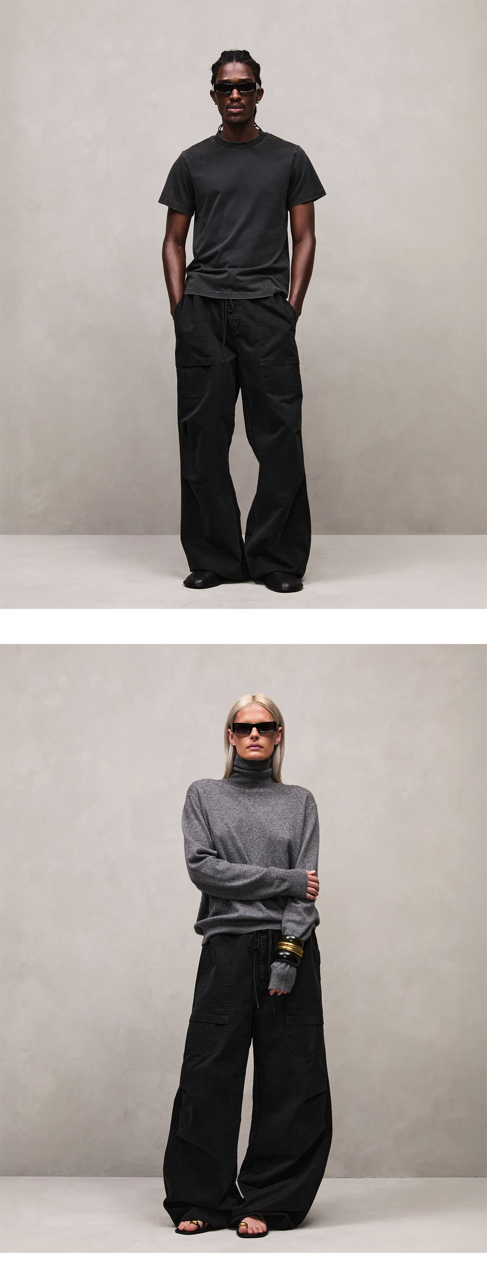 와이드한 핏의 엔타이어스튜디오 배런 카고 워시드 블랙입니다. - 100% 코튼 - 와이드 핏 카고 팬츠 - 플리츠 디테일 - 앞면 가셋 포켓 - 허리와 밑단에 사이즈 조절 가능한 스트링이 있음